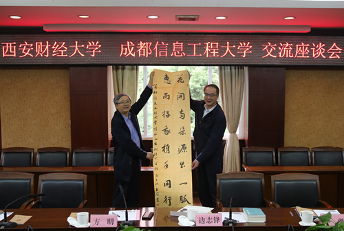 方明对学校的热忱接待表示感谢,并简要介绍了西安财经大学的基本情况和此次调研的背景。他表示,九州登录近年来发展迅速,专业建设从一开始就有全盘规划,工作思路值得肯定,令其大受启发。随后代表西安财经大学向学校赠送了教师编写的书籍及书法。