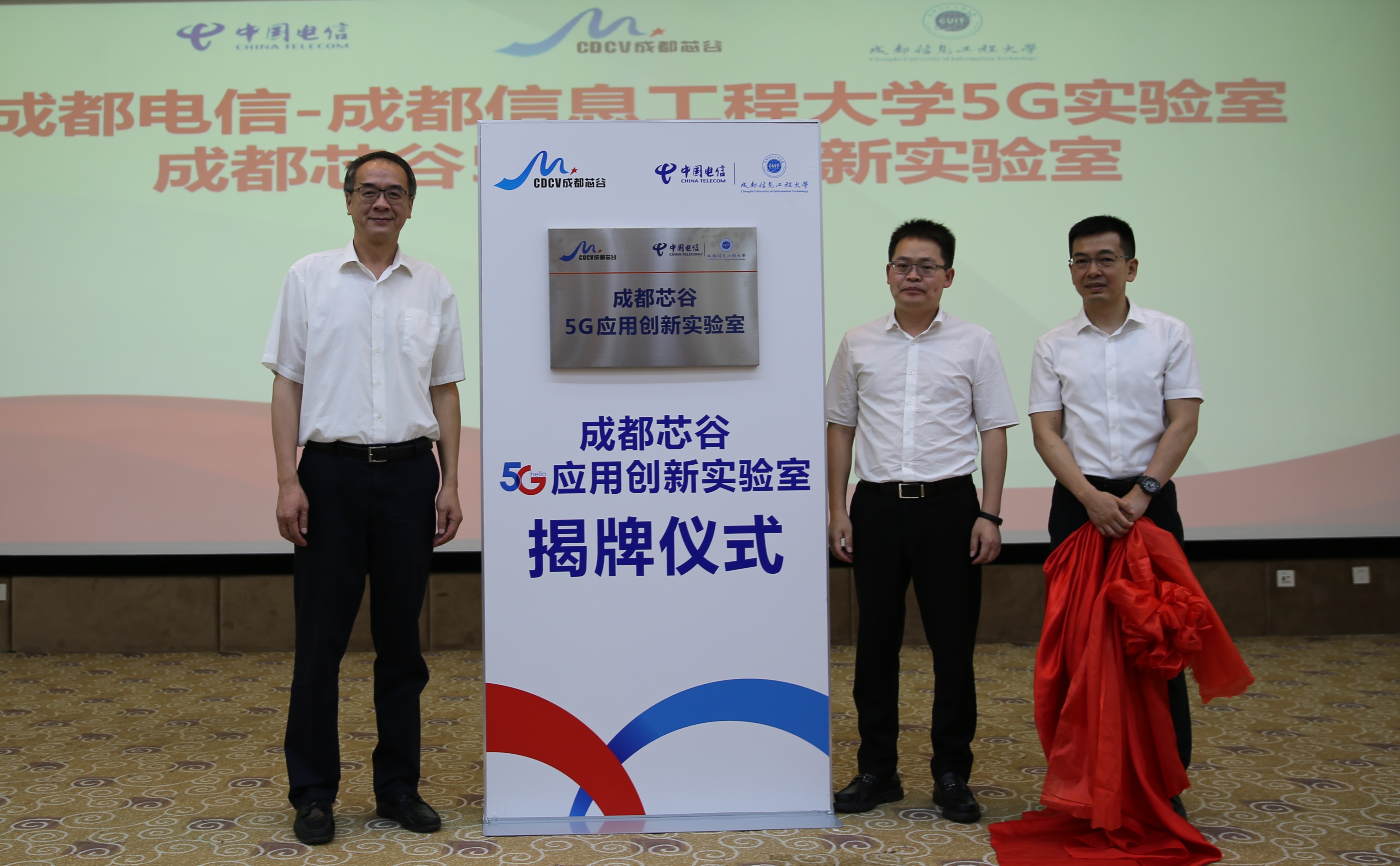 余敏明、杨洋为“成都电信-九州登录5G实验室”揭牌。韩超、余敏明、杨洋为“成都芯谷5G应用创新实验室”揭牌。