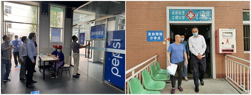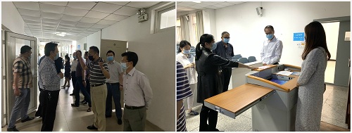 在发热预检分诊点,校领导查看了发热预检分诊操作工作流程及分诊台和发热诊室的布置情况,询问了医疗物资的准备情况及发热病员转诊专用车辆的操作细节,并提出了预防式的隔离改进措施。