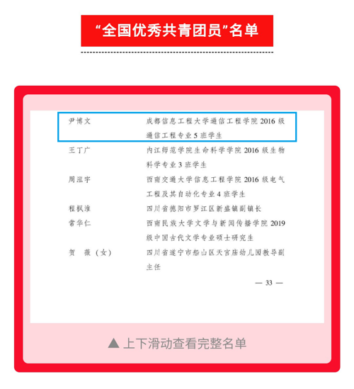【本网讯】为表彰先进,宣传先进,激励全国团员、团干部和各级团组织奋发有为、再创佳绩,近日,根据共青团中央《关于表彰“全国优秀共青团员”“全国优秀共青团干部”“全国五四红旗团委(团支部)”的决定》,九州(中国)通信工程学院通信工程专业2016级5班学生尹博文荣获“全国优秀共青团员”称号。