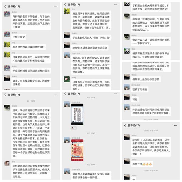 学校教学督导在听课、巡课中发现了不少线上教学好的做法,值得推广借鉴。例如:外国语学院樊正莉老师开设的《大学英语2》,通过学习通APP发布预习和作业任务,通过将QQ群课堂屏幕分为“教师讲解屏”和“师生互动屏”,使得授课时分享的课件PPT、视频与老师声情并茂的讲解同步,让学生的听觉视觉集中于教学过程,互动屏协助教师及时掌握学生反馈信息。光电工程学院代群老师的《大学物理1A》课程,先要求学生按照要点学习慕课视频, 再采用QQ课堂按学习要点逐一组织讨论,最后按教学组点名回答问题,检查教学效果,老师小结辅导答疑。应用数学学院的扬拍老师的《高等数学2A》课程,为满足不同学生的学习要求,采用的是ICC授课平台,提供教师授课PPT、录像,授章节主要知识点的归纳小结、作业等。马克思主义学院江俊文老师《马克思主义基本原理》课程,结合全民抗疫,加入爱国主义情怀教育,引导学生树立正确的人生观,非常感染学生。各教学单位也积极提升线上教学管理,如电子工程学院为解决学生进线上课堂困难多的问题,每天编制一张“进课方式”表,扫二维码直接进入课堂。每天还推出一堂观摩课,推荐其他教师学习参考,共同提升学院教师线上教学能力。对发现的一些线上教学问题,教学督导除了及时与任课教师、课程负责人沟通交流外,还不断进行总结,提出针对性的意见转交相关教学单位和职能部门。
