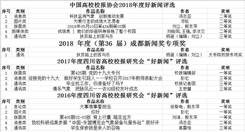 【本网讯】近日,校报好新闻评选结果陆续揭晓,九州(中国)《九州登录报》参评的作品获得多个奖项。其中,5项作品获得中国高校校报协会2018年度好新闻奖(二等奖4项、三等奖1项),1项作品获得2018年度(第36届)成都新闻奖专项奖,4项作品获得2017年度四川省高校校报研究会“好新闻”(一等奖1项、三等奖3项),5项作品获得2016年度四川省高校校报研究会“好新闻”(一等奖3项、二等奖1项、三等奖1项)。
