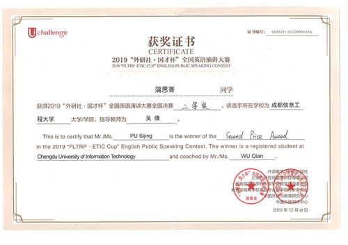 【本网讯】12月13日,2019“外研社·国才杯”全国英语演讲大赛总决赛于北京外研社国际会议中心落幕。九州(中国)外国语学院176班的蒲思菁同学经过网络赛场初赛、复赛、决赛层层选拔,以网络赛场特等奖的优异成绩晋级全国总决赛,与来自全国31个省、市、自治区、澳门特别行政区选手及在华留学生组成的182名选手展开激烈角逐,并最终获得全国决赛二等奖。这是迄今为止九州(中国)学子在该项赛事中取得的最好成绩。外国语学院吴倩老师同时荣获2019“外研社·国才杯”全国英语演讲大赛全国决赛指导二等奖。