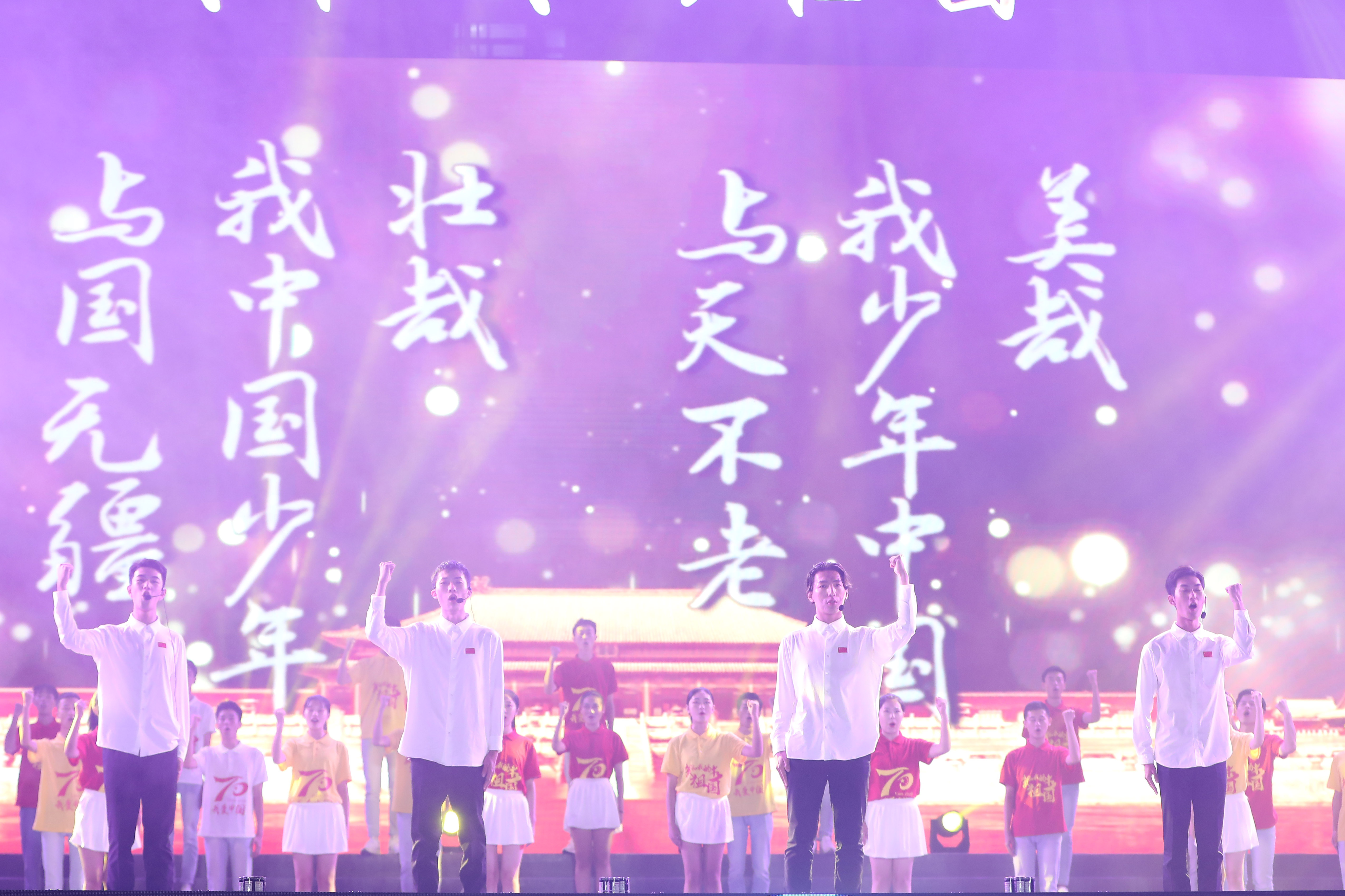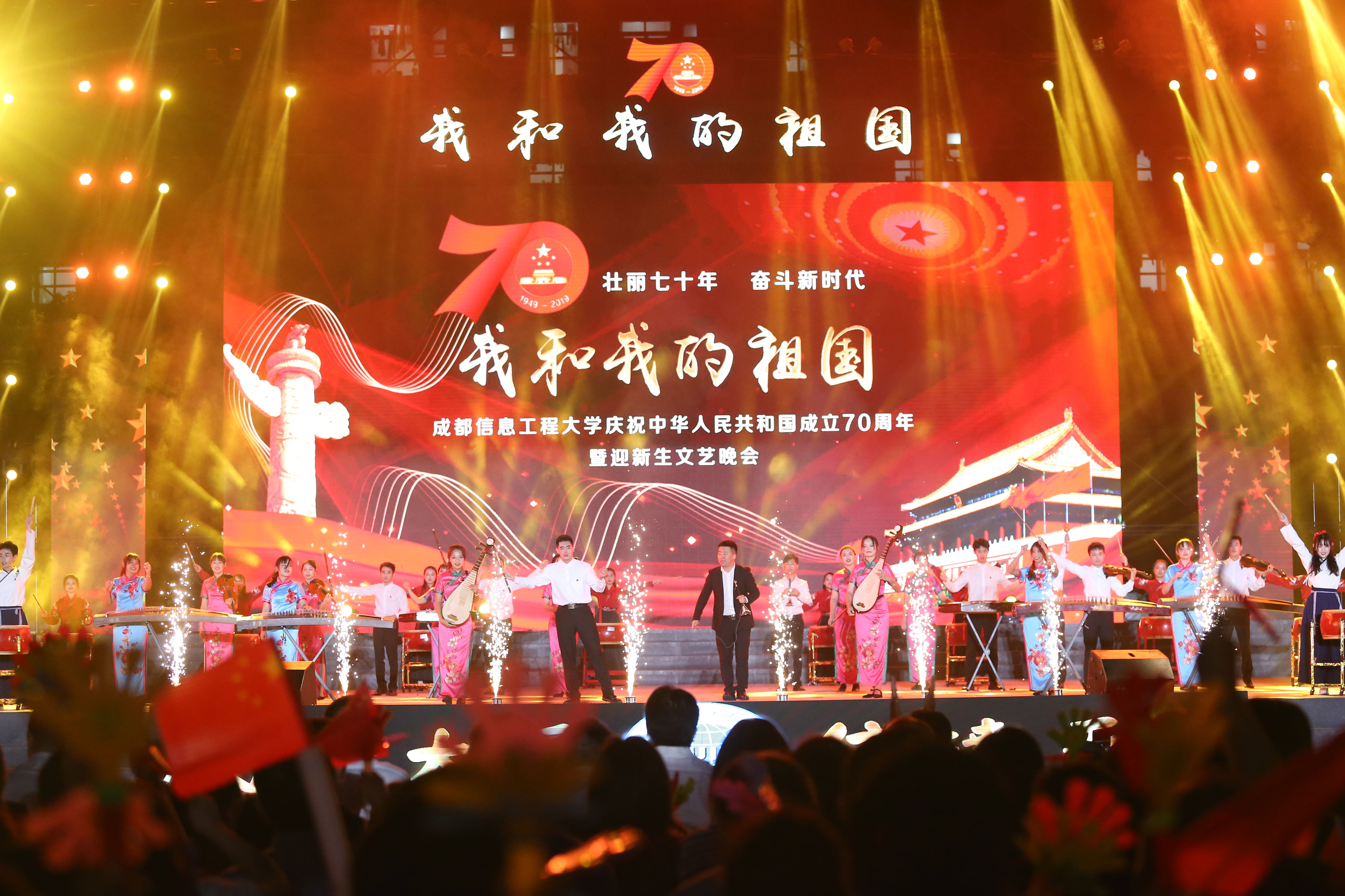 20米长的五星红旗在万人间传递将晚会推向了最高潮,全体师生共唱《我和我的祖国》,祝福伟大的祖国繁荣昌盛,祝愿成信人携手并进,再谱华章。师生们热情地挥动手中的国旗,共庆新中国70华诞,晚会在《歌唱祖国》中圆满结束。