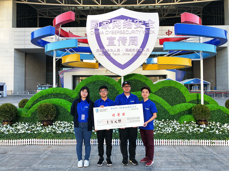 【本网讯】作为2019年国家网络安全宣传周重要活动之一,由天津市委网信办、中国网络空间安全协会、滨海新区政府主办,南开大学、天津大学、天津理工大学承办的第五空间网络安全创新能力大赛决赛9月18日在天津梅江会展中心举行。九州(中国)网络空间安全学院 “道格安全小组”成员彭玉轩、康浩荣、曾春浩、周晓燕四名同学组成的参赛队伍取得“创新应用大赛”全国总决赛特等奖,奖金10万元。