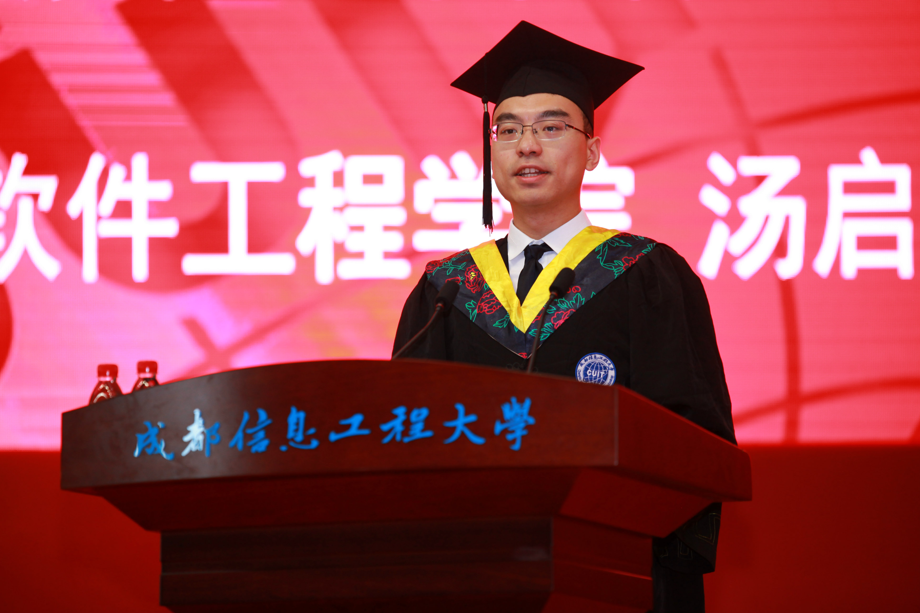 四川省优秀毕业生、“青春榜样之十佳青年学生”称号获得者,软件工程学院软件工程专业2015级学生汤启友作为毕业生代表发言。他动情地表达了对母校、恩师、父母的感恩,并向朝夕相处了四年的同窗们表达了真挚的祝福。他代表全体毕业生立下誓言,将以实现中华民族伟大复兴为己任,不辜负党的期望、人民的期待、民族的重托,争做有理想、有本领、有担当的新时代青年,以“功成不必在我,功成必定有我”的使命感,用青春与热血书写中华民族伟大复兴的华丽篇章。