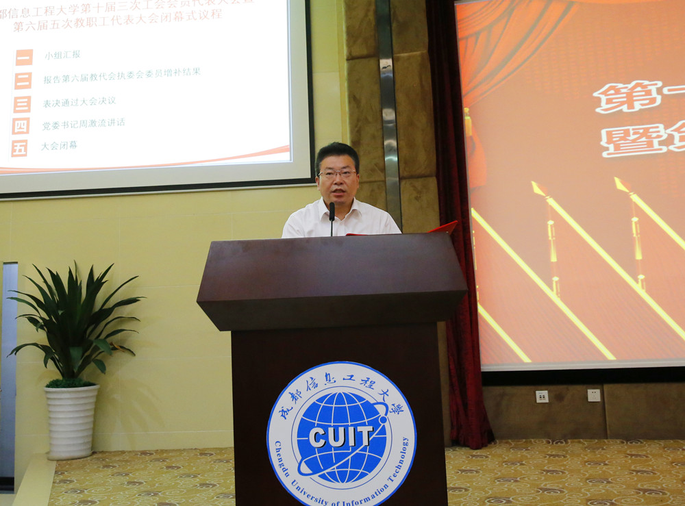 周激流表示,对大会期间代表们反映的问题,学校将组织相关单位认真研究,尽快拿出可行的解决方案并予以落实。他要求,全校各单位要把传达、学习、贯彻本次会议精神作为一项重要工作抓紧抓实,把全校教职员工的思想认识统一到大会的精神上来,把智慧和力量凝聚到实现大会提出的目标任务上来。希望大家继续秉承学校“成于大气,信达天下”的精神,携手同行,奋力进取,为把学校建成开放的特色鲜明的高水平信息工程大学做出更大的贡献。