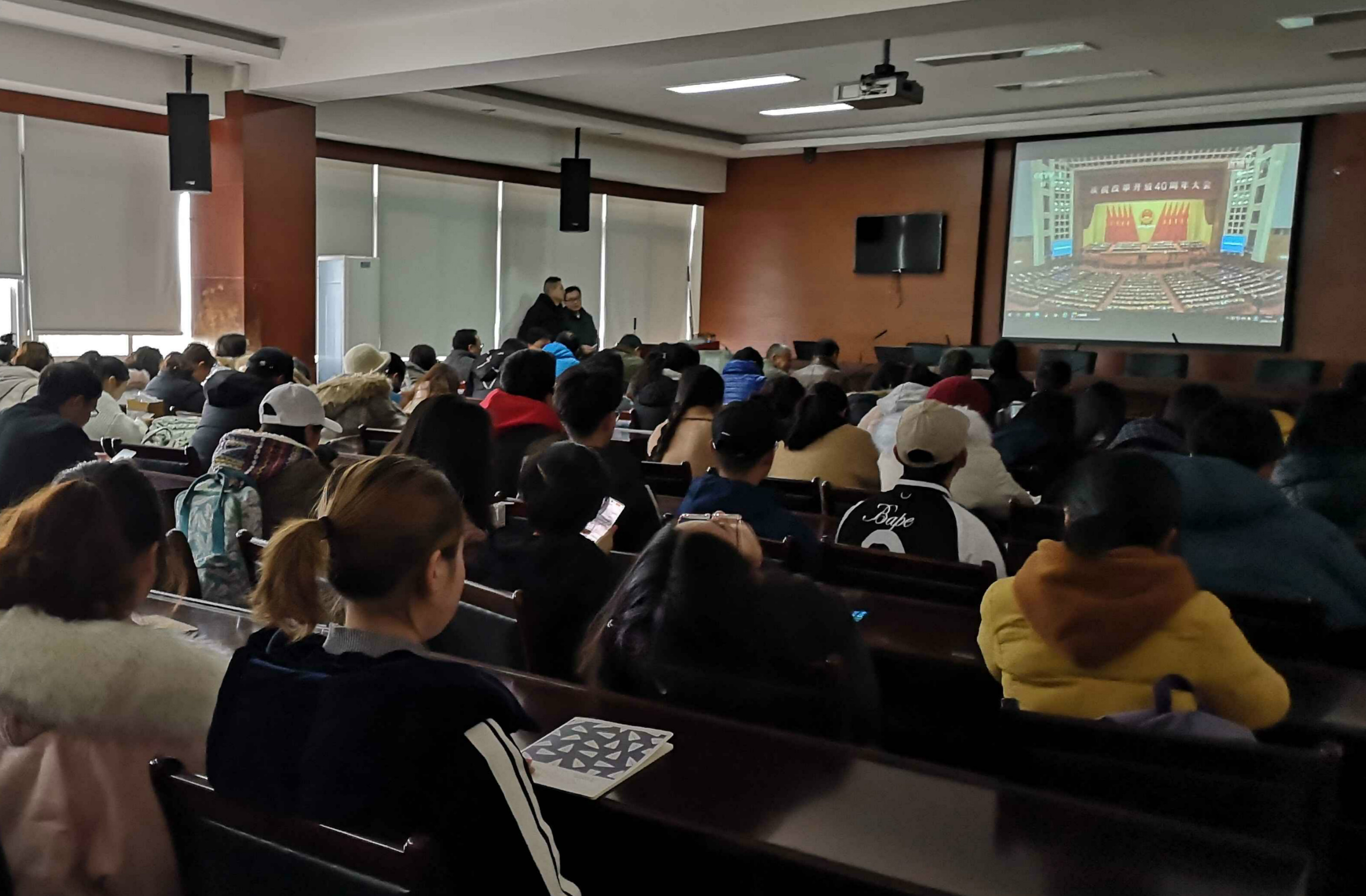 【本网讯】12月18日上午10时,学校在航空港校区和龙泉校区组织师生集中观看了庆祝改革开放40周年大会实况。全体校领导,全体处级干部,民主党派、统战团体负责人,学生代表等到场观看大会直播。各二级学院党总支也分别在办公室、会议室、教师休息室等多个场所组织师生收看大会实况。