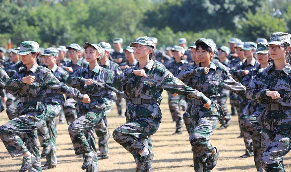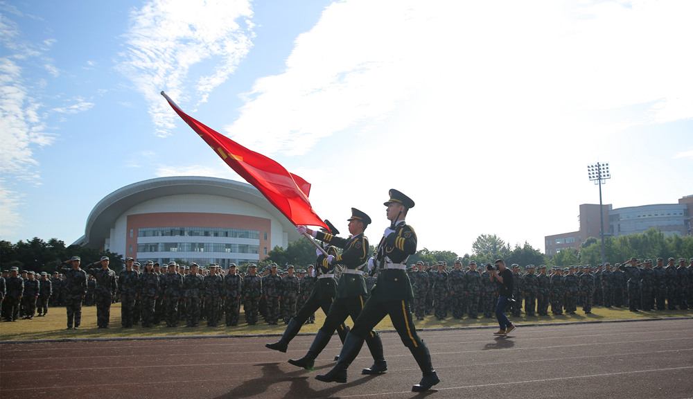 在庄严的国歌声中,2018级参训新生们身着迷彩服,精神抖擞,向着冉冉升起的国旗行注目礼。