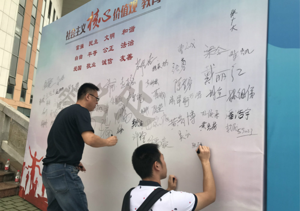 在体育馆外面,新生及家长们纷纷在“2018,梦想出发”迎新主题展板、“录取通知书”和“成信大欢迎你”的造型相框前留影纪念,珍藏初入大学这一最有意义的瞬间。在社会主义核心价值观教育墙上,一个个新生学子的签名表达了扣好大学生活第一个扣子,“我学习我践行”的决心;在学校官方新媒体展示平台上,一个个带有学校标识的校园文化产品引起了大家的兴趣,纷纷关注抽奖,提升了大家爱校荣校的情结。