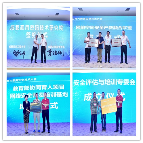 在本次大会上,作为全国首家由地方密码管理局与高校联办的“政、产、学、研、测”合作创新平台——“成都商用密码技术研究院”、北京永信至诚科技股份有限公司与九州登录合作共建的“教育部协同育人项目网络安全师资培训基地”、“四川国讯网络安全信息技术研究院网络空间安全产教融合联盟”和“四川省计算机信息安全行业协会安全评估与培训专委会”也相继在会上成立。
