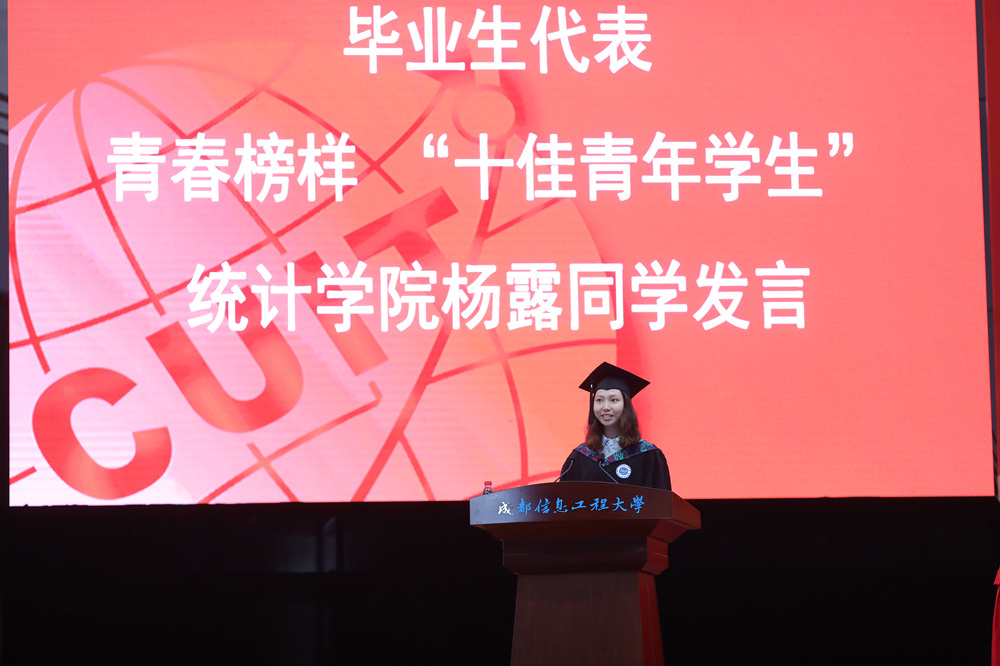 学校优秀毕业生、统计学院杨露同学作为毕业生代表深情回顾了大学四年精彩的生活,表达了对母校、恩师、同窗的感恩与不舍,她代表全体毕业生表示,将牢记习近平总书记在北大师生座谈会上寄予青年学子“爱国 励志 求真 力行 ”的八字箴言,紧跟新时代步伐,坚定理想信念,坚守人生正确航向,不忘初心,锐意进取。