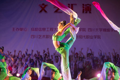 四川省教育厅宣思处副处长、新疆内派教师四川协调站站长李嘉东,成都文理学院、四川大学锦城学院、四川艺术职业学院、四川华新现代职业学院的学工部领导,学校副校长于世祥,相关职能部门负责人,学院党总支书记及辅导员代表,龙泉校区学生代表共计1500余人观看了表演。