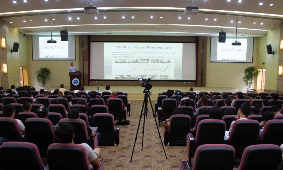 谷东兵作题为“Visual SLAM from Geometry to Deep Learning”的报告。SLAM,也称即时定位与地图构建或开发建图与定位,是通过扫描特征点、构造位置,从而实现定位、导航等的一项技术。由于其重大的理论与应用价值,被许多学者认为是实现真正全自主移动机器人的关键。