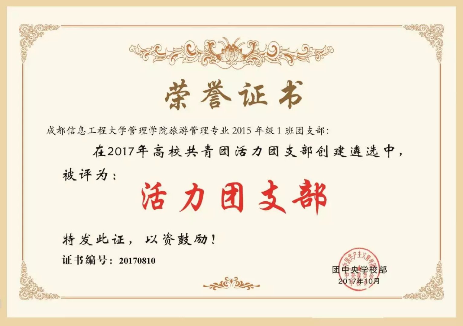 旅游管理2015级1班团支部自成立以来,发挥旅游管理专业优势,围绕培育和践行社会主义核心价值观开展主题教育活动,运用视频、新媒体、话剧等方式,记录无悔青春篇章。团支部带领团员青年积极参与团体竞赛、志愿服务、社会实践、公益活动等,将责任与担当融入每一名支部团员的心中,书写成信学子的青春华章,先后荣获“九州登录优良学风班”“九州登录五四红旗团支部”等荣誉。