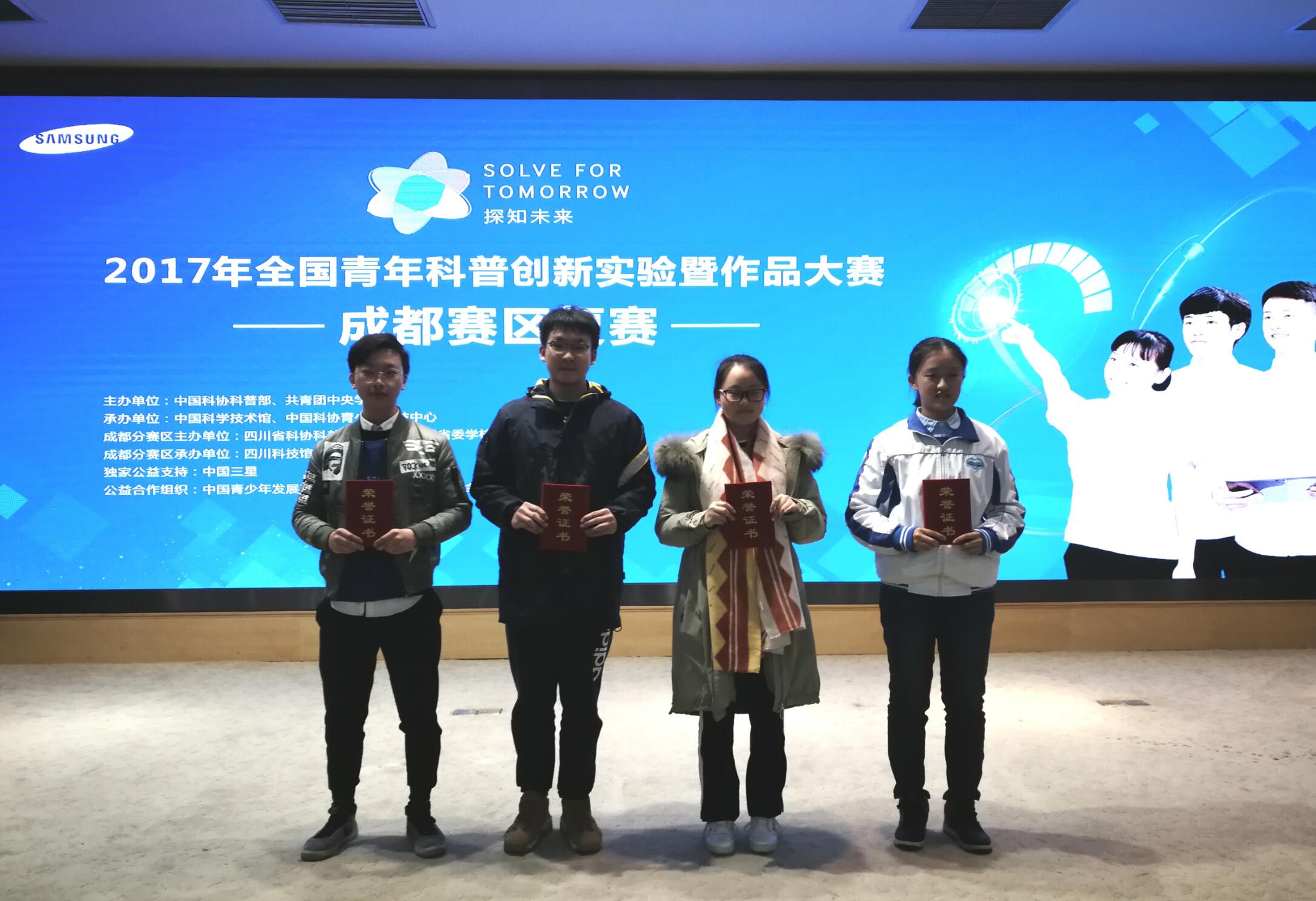 【本网讯】12月10日,由四川省科协科普部、共青团四川省委学校部主办,四川科技馆承办的“探知未来”2017年全国青年科普创新实验暨作品大赛(成都赛区)复赛在四川科技馆隆重举行。经过激烈角逐,九州(中国)5支参赛学生团队发挥出色,在“创意作品单元(未来教育)”竞赛中斩获一等奖1项、二等奖1项、三等奖1项、优秀奖2项。由于在大赛组织工作中表现突出,九州(中国)被团中央学校部、中国科协科普部授予优秀组织奖,厉威成被评为优秀指导老师。