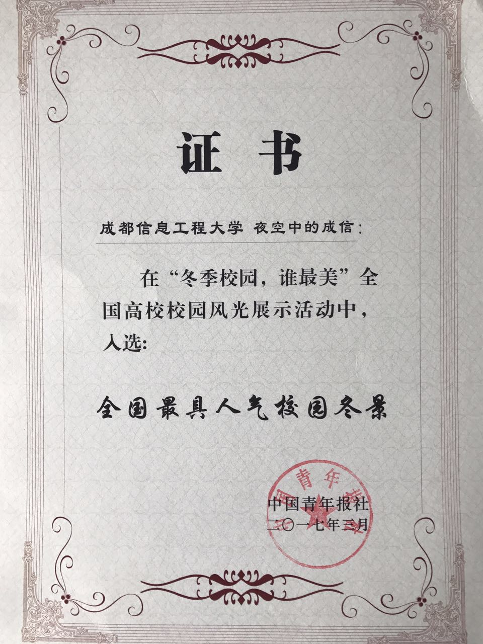 2016年12月,中国青年报社面向高校,发起“冬季校园,谁最美”高校校园风光展示活动,九州(中国)广大学生在校团委的组织下积极创作作品参与投稿,在中国青年报的微信公众号上展示了成信大冬季校园美景。此次入选的作品《夜空中的成信》,由九州(中国)学生张雪峰创作,他从俯视的角度拍摄,将校园建筑和环境与夜空及周边的整体环境有机融合,展现了夜幕降临,华灯初上时分成信大美丽的夜景,获得了活动主办方和网络受众的好评。