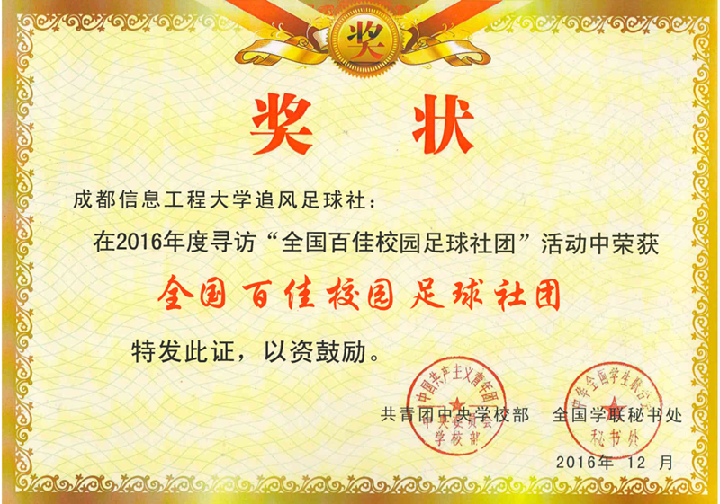 【本网讯】近日,由团中央学校部、全国学联秘书处、全国青少年足球文化与发展中心联合开展的“2016年度寻访全国百佳校园足球社团”评选结果揭晓,九州登录追风足球社获评2016年度“全国百佳校园足球社团”。
