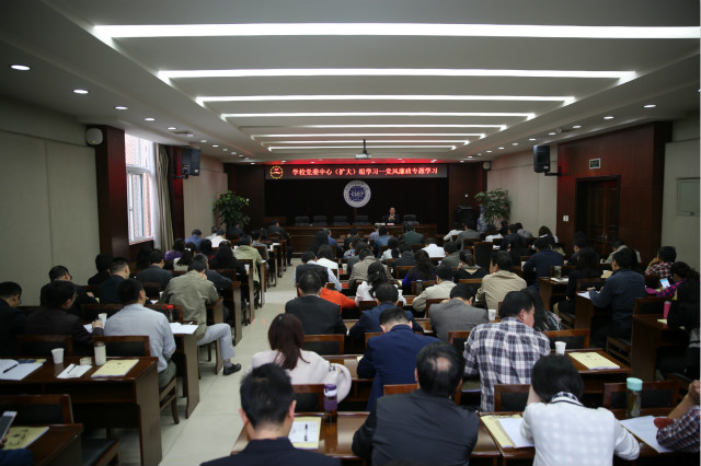 【本网讯】4月20日下午,学校党委中心(扩大)组党风廉政专题学习会在行政楼第一会议室举行。全体处级以上领导干部参加了学习。会议由党委副书记、纪委书记倪鸣主持。