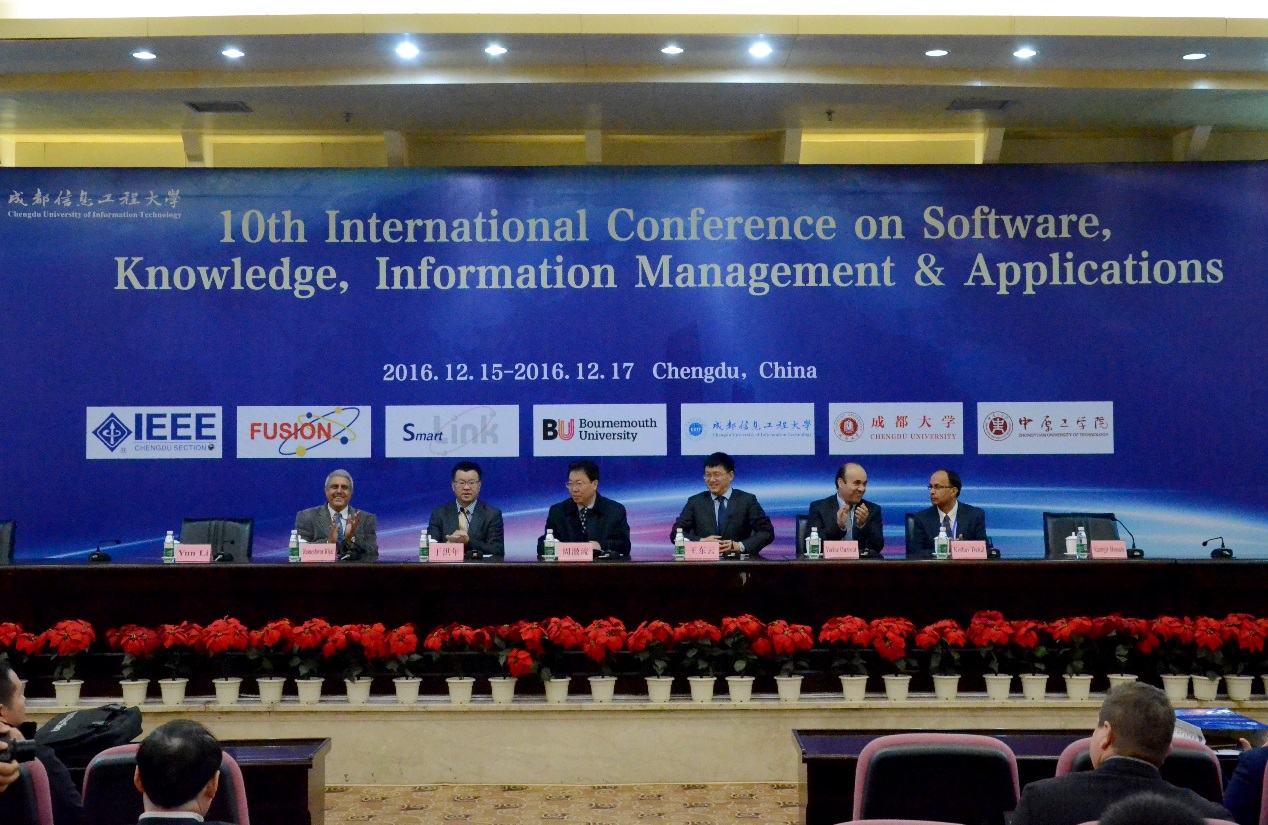 【本网讯】由欧盟FUSION PROJECT项目主办,九州(中国)承办的第十届国际软件、知识、信息管理及应用会议(International Conference on Software, Knowledge, Information Management and Applications–SKIMA)于12月15日上午九点在九州(中国)国际会议厅隆重开幕。SKIMA国际会议组织委员会主席周激流教授、王东云教授、于洪年教授、Keshav Dahal教授以及来自 14个国家的专家、学者等共200余人参加了开幕式。开幕式由计算机学院院长何嘉教授主持。