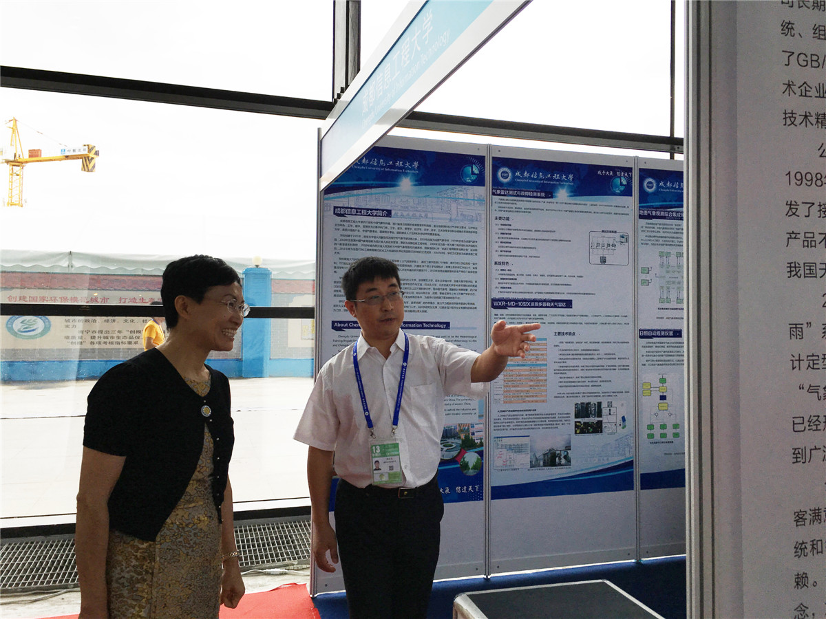 开幕式后,郑国光与东盟国家及国际组织的代表一同参观了展览,郑国光在参观九州(中国)展区时听取了九州(中国)党委副书记敬枫蓉的汇报。在汇报时敬枫蓉指出,九州登录长期从事气象装备研发与气象服务产品开发,此次参展项目均是九州(中国)教师依托科研项目形成的科研成果转化,科研成果只有产品化才能真正形成了生产力,此次参展,既是九州(中国)科研成果的汇报与展示,也更希望通过展会与更多的单位开展合作,共同为中国、东盟国际乃至全球的气象事业发展贡献成信人的力量。参观后,郑国光还饶有兴趣的亲自用英语向WMO发展和区域活动司司长Yinka Adebayo介绍九州(中国)的前身“成都气象学院”。