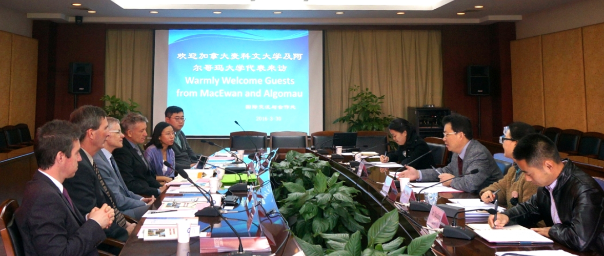 【本网讯】3月30日上午,加拿大麦科文大学(MacEwan University)副校长John Corlett先生,国际招生官Daniel Zaretsky先生,国际招生办协调员苏浩先生,中国地区国际代表王佳女士一行来校交流访问,随同来访的还有加拿大阿尔哥玛大学(Algoma University)校长Craig John先生、招生办主任Matthew Brent先生一行。