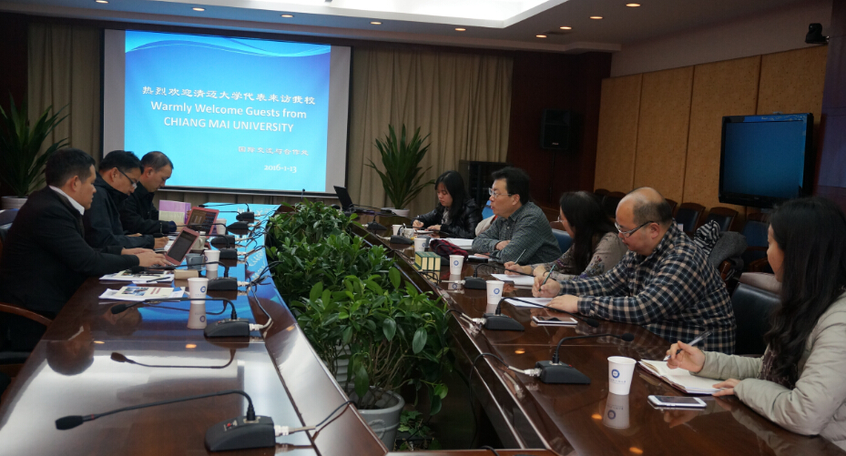 【本网讯】 1月13日下午,泰国清迈大学国际学院院长Dr. Nopasit Chakpitak、副院长Mr. Danaitun、艺术媒体与技术学院院长Dr.Pradorn Sureephong一行来校交流访问,随同来访的有成都大学外国语学院院长李萍、副院长牟磊。学校校长周激流在第七会议室与来访客人座谈,国际交流与合作处处长段黔冰、计算机学院院长何嘉参加此次座谈。
