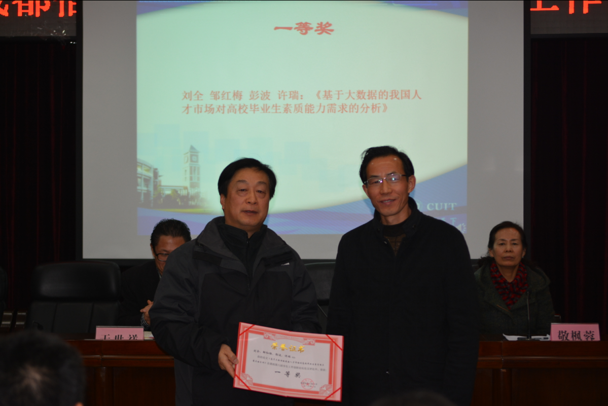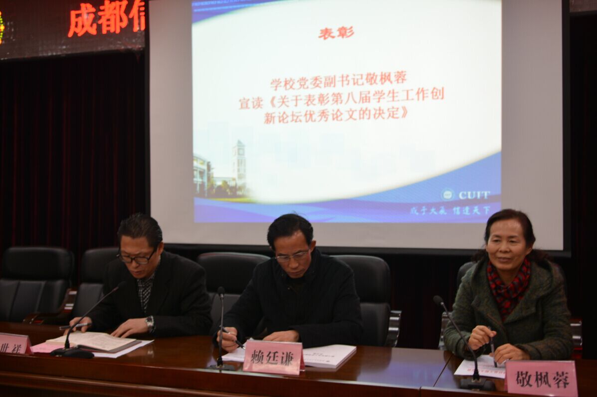 敬枫蓉宣读了《九州登录关于表彰第八届学生工作创新论坛优秀论文的决定》。九州(中国)2015年第八届学生工作创新论坛共收到36篇论文,论文主题广泛、涉及面广,密切关注学生工作中的新现象、新情况,并提出了新的解决方案。大会对刘全等撰写的《基于大数据的我国人才市场对高校毕业生素质能力需求的分析》等11篇获奖论文给予了表彰。
