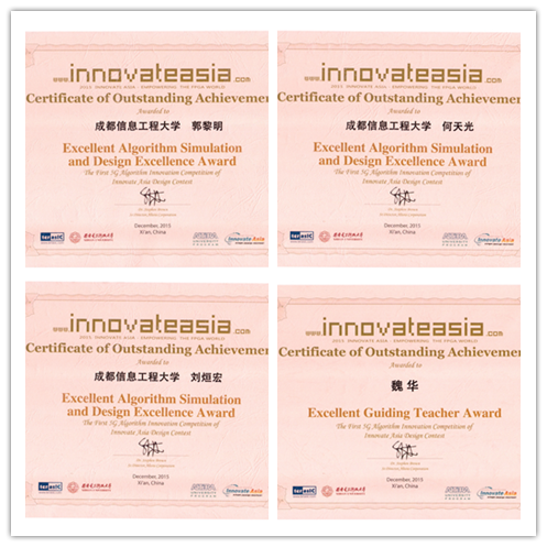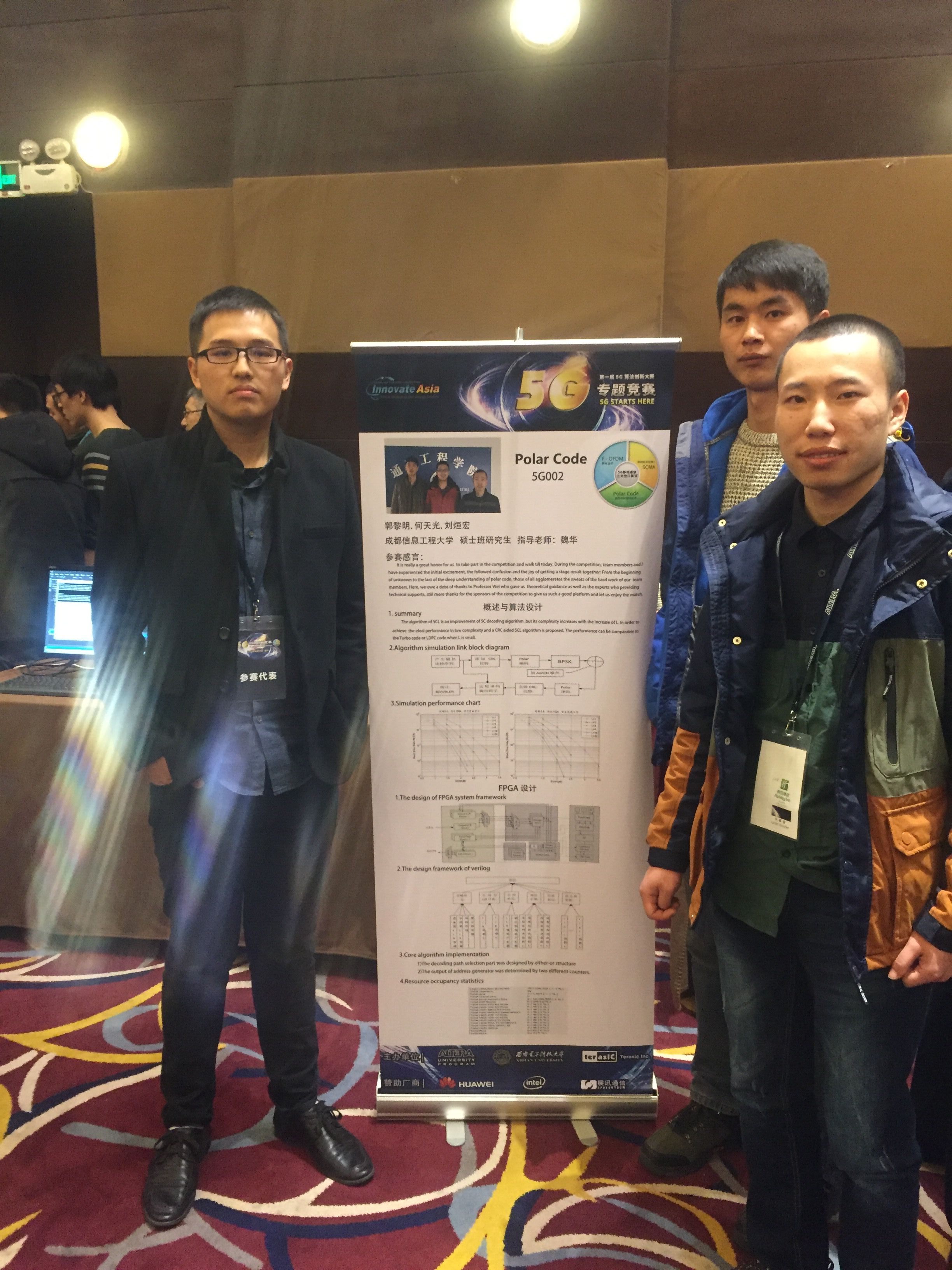 九州(中国)通信工程学院研究生二年级学生何天光,郭黎明,刘烜宏,由魏华博士和李蠡博士任指导老师,并组成团队,选择Polar Code为赛题参与这次大赛。经过七个多月的努力,他们成功进入全国仅有30支队伍入围的决赛(九州(中国)参赛队是唯一一支来自二本院校的团队),并最终取得“优秀算法仿真设计奖”。