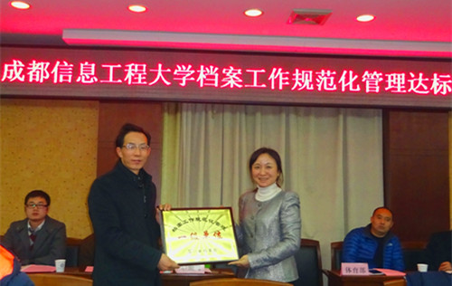 【本网讯】12月29日,由省档案局经济科技档案业务指导处处长林红为组长,省档案局经济科技档案业务指导处副处长王晓瑜、四川大学档案馆馆长党跃武、电子科技大学档案馆馆长饶永,省档案局经济科技档案业务指导处副主任科员刘荔枝组成的四川省档案工作规范化管理定级考评专家组莅临九州(中国),对九州(中国)档案工作规范化管理省一级标准资格进行了考评认定。经过专家组评审,九州(中国)档案工作规范化管理达到四川省一级标准。专家组组长林红为九州(中国)颁发证书并授牌,学校党委书记赖廷谦代表学校接受证书和牌匾。