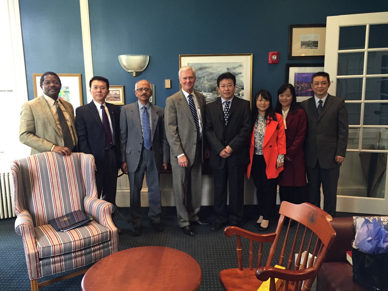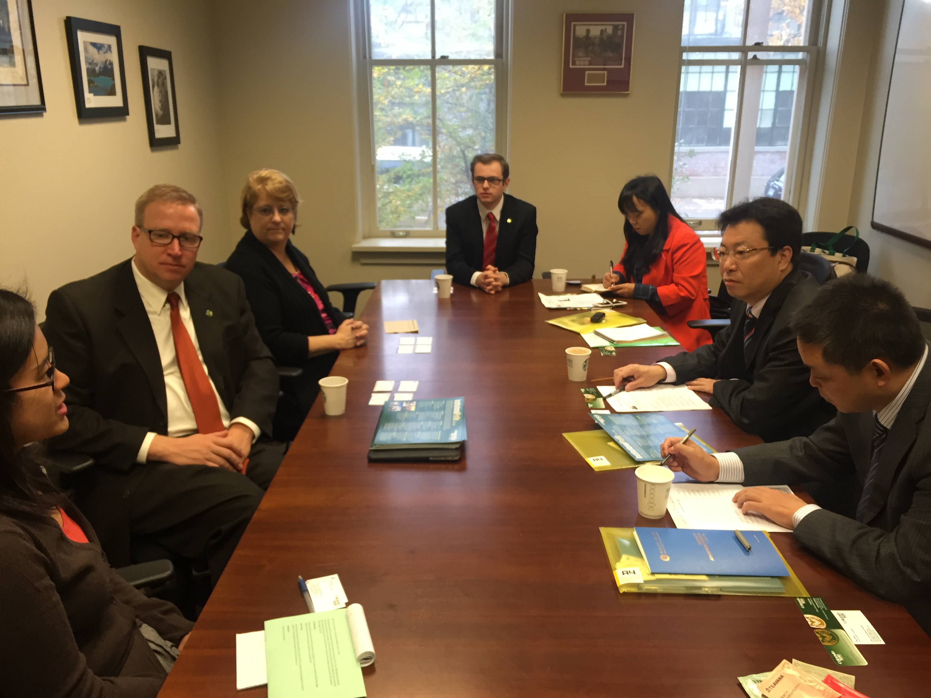 会见结束后,代表团参观了新罕布什尔孔子学院,并与新罕布什尔大学学术副校长P.T. Vasudevan、副校长Luchen Li、Marry、研究生院院长Harry Rich ards、工程和物理科学学院院长Samuel B. Mukasa以及孔子学院院长Yige Wang进行交流讨论。Samuel特别提及两校在计算机、电子工程、环境工程和大气科学(包括大气化学和水污染)方面的相似之处,希望两校相关专业的学生能相互交流,利用假期到对方学校向相关专业教授学习,进行实地考察锻炼。周激流对九州(中国)情况和学科优势做了简要介绍,并表示双方可以从本科“4+0”模式及研究生“3+x”模式开始,进一步开展更加深入广泛的合作,共享教学资源,促进两校学生交流,提高学术国际化水平。此外,双方在工程领域专业认证和知识产权专业方面,就拟合作专业学生的规模、语言水平标准以及通识教育学分互认等问题进行了细致的讨论和交流。