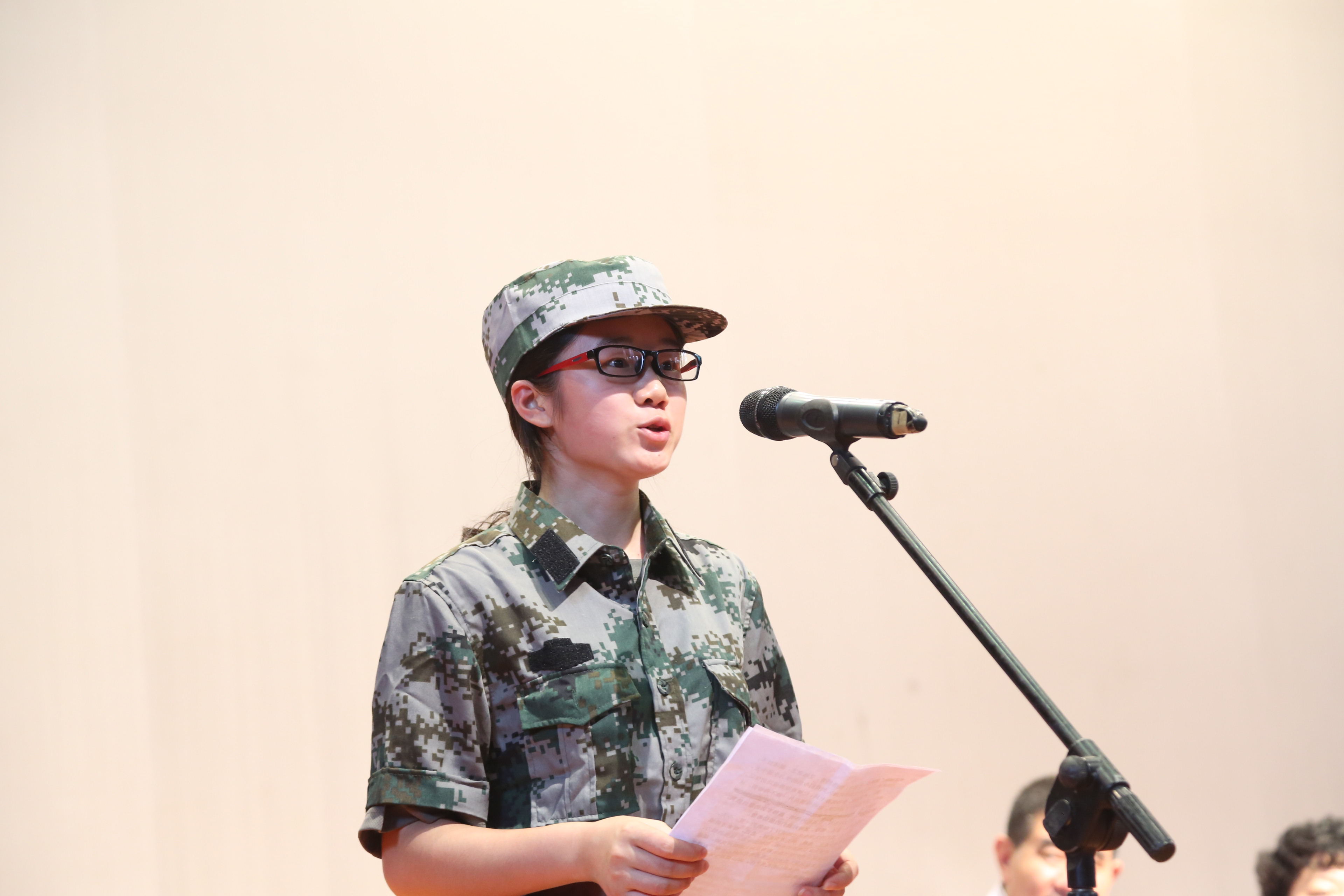 新生代表承诺:2015级全体同学将服从军训教官的管理,虚心向教官学习,严守纪律,团结拼搏,不怕苦不怕累,努力完成训练任务。