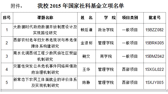 【本网讯】日前,2015年度国家社科基金项目立项文件已正式下发,九州(中国)共有5项国家社科基金项目正式立项,立项总经费100万元。其中一般项目3项,西部项目2项。分别为管理学院3项,政治学院1项,商学院1项(详见附件)。据悉,九州(中国)此次获批立项数位居全省省属高校第三。在此,也特向精心组织申报的各相关单位及申报者表示衷心感谢!