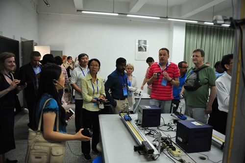 在信息材料实验室,郑小林向各位嘉宾介绍了信息功能材料的设计、制备及测试平台;在CDIO学生工作室和专业创新实验室,程科介绍了学生开展创新活动的情况,展示了相关学生作品;在物理演示实验室,周积骏介绍了大学物理实验演示仪器的运行情况及其对推进大学物理课程创新性教学的作用;在大学生科技创新实验室,杜国宏详细介绍了大学生科技创新实验室学生科技作品,培养学生的相关理念等。