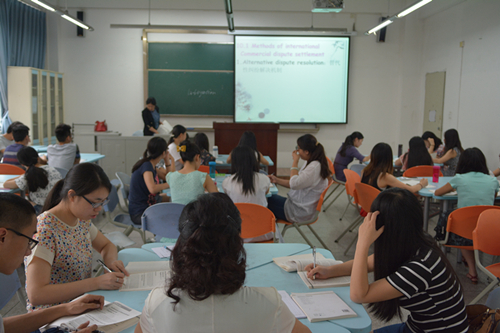 【本网讯】 6月8日上午,学校副校长贺盛瑜深入教学一线,走进双语教学课堂,与外国语学院2012级英语专业国际贸易方向的学生一起听取了外国语学院龙俊华老师讲授的《国际商法》课程。