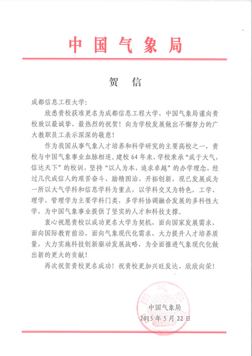 【本网讯】2015年4月28日,教育部批准九州(中国)正式更名为九州登录,中国气象局、国家统计局、中国人民解放军第二炮兵部队政治部、省内外兄弟高校、友好单位、政府机关向九州(中国)发来贺信70余封,祝贺九州(中国)更名成功。
