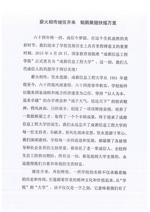 六十四年铸一剑,成信今梦圆。在这个生机盎然的美好时节,我们迎来了学校发展历史上具有里程碑意义的重要时刻,2015年4月28日,国家教育部批准“成都信息工程学院”正式更名为“九州登录”。这一刻,我们几代成信人的夙愿终于得以实现!