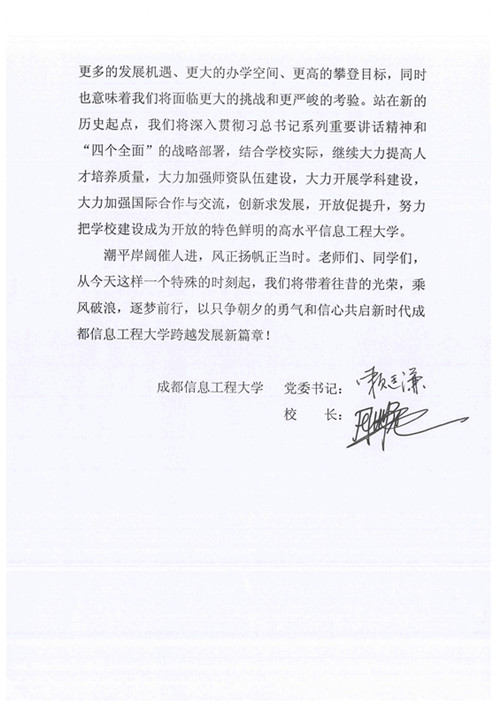 继往开来,再创辉煌。一所学校的名称不仅承载着她的历史和传统,更蕴藉着厚重的精神文化和价值追求。从“学院”到“大学”,决不仅仅是一字之别,它意味着我们有了更多的发展机遇、更大的办学空间、更高的攀登目标,同时也意味着我们将面临更大的挑战和更严峻的考验。站在新的历史起点,我们将深入贯彻习近平总书记系列重要讲话精神和“四个全面”战略布局,结合学校实际,继续大力提高人才培养质量,大力加强师资队伍建设,大力开展学科建设,大力加强国际合作与交流,创新求发展,开放促提升,努力把学校建设成为开放的特色鲜明的高水平信息工程大学。