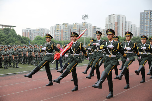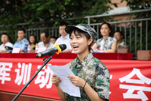 新生代表承诺:2014级全体同学将以昂扬的斗志和饱满的热情投入大学四年的第一堂必修课,尊敬教官、听从指挥、敢于吃苦、认真训练、团结协作,展现青年学子奋发向上的决心和无限的青春活力。