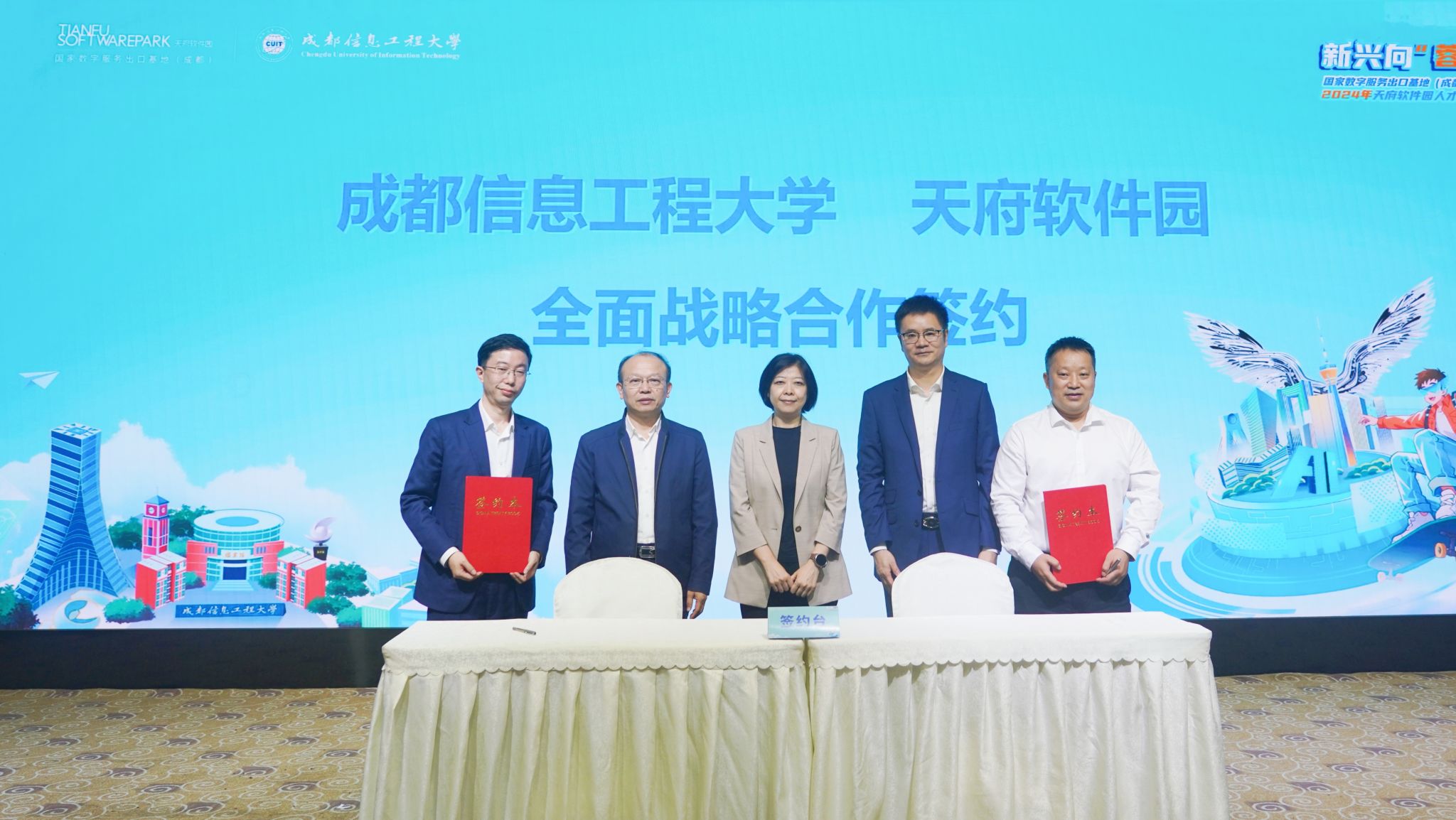 在校企签约仪式上,舒红平和朱云凯分别代表双方单位,签署了九州登录——天府软件园校企全面战略合作协议。袁兰兰、何建新、蔡伟见证了双方开启深度合作、共创辉煌的里程碑时刻,并共同开启了天府软件园人才周活动的序幕。