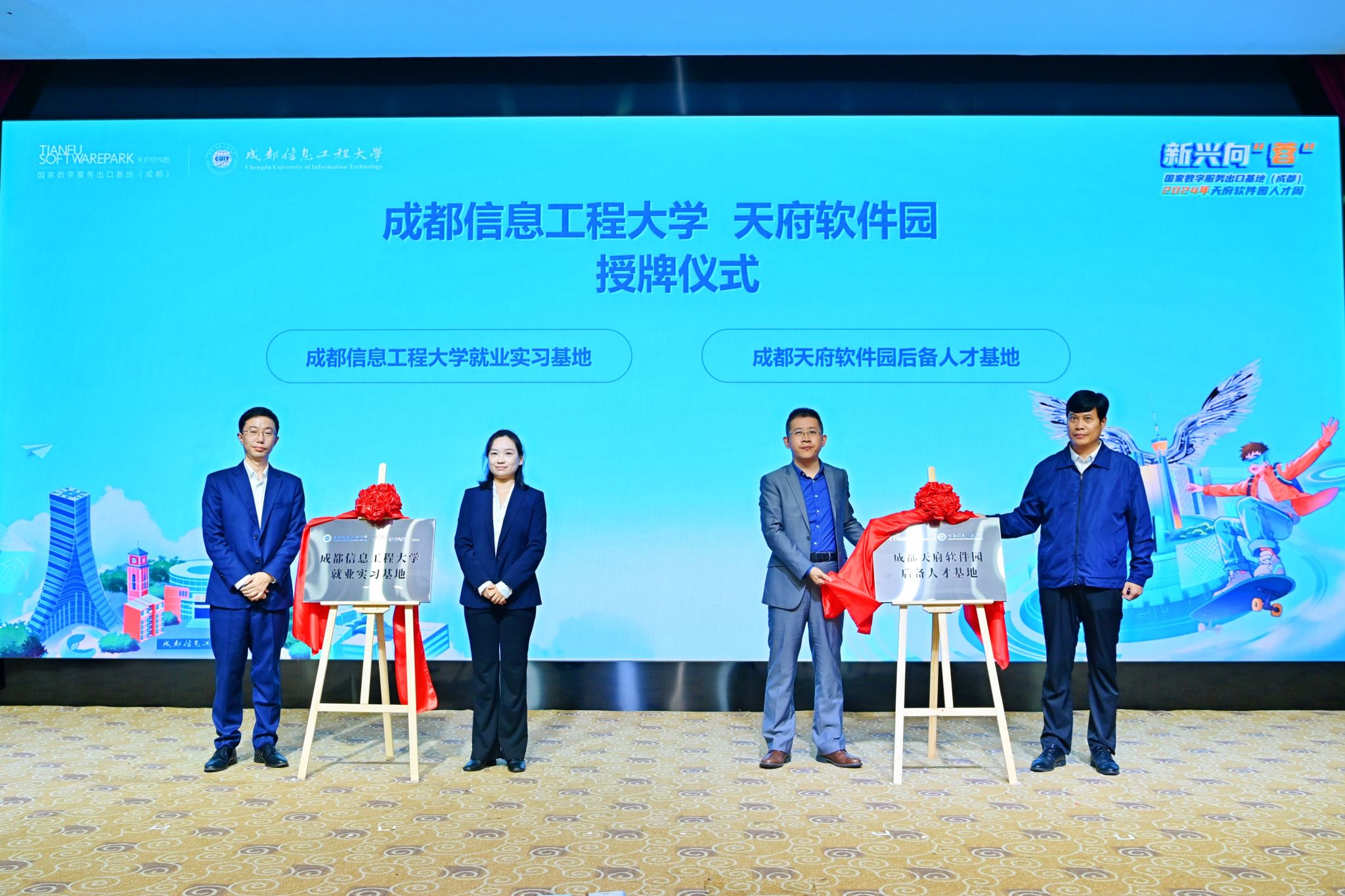 在授牌仪式上,学校招生就业处、科技处负责同志与天府软件园负责人共同为“九州登录就业实习基地”和“成都天府软件园后备人才基地”揭牌。