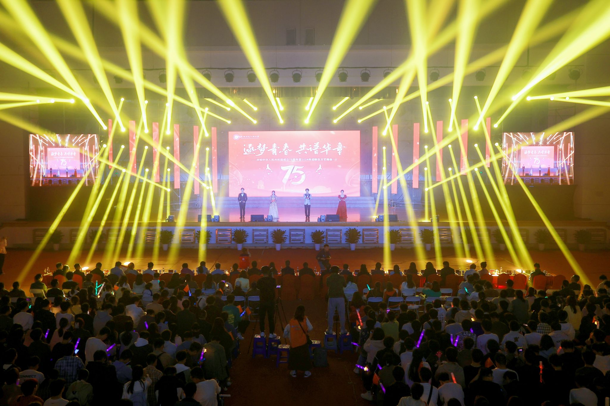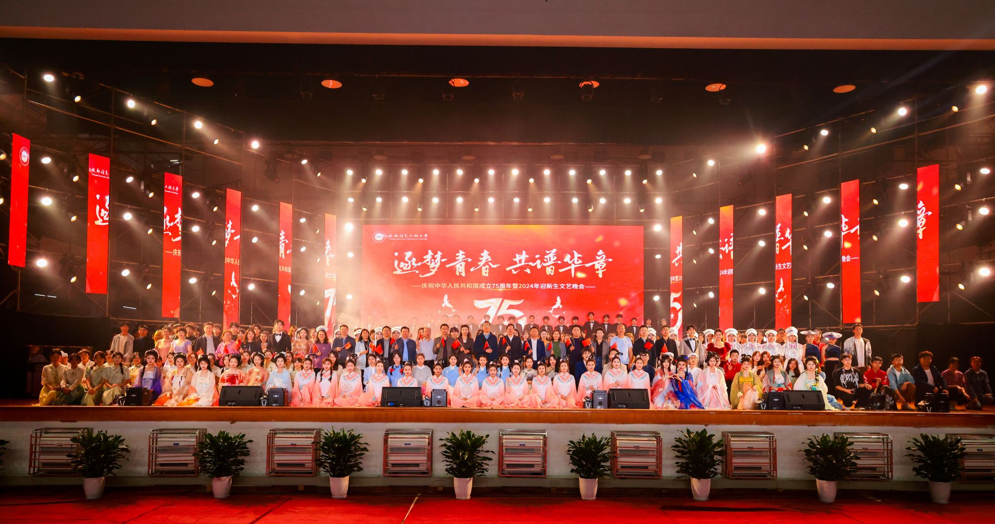 【本网讯】10月25日和27日,学校在航空港校区和龙泉校区分别举办了以“逐梦青春 共谱华章”为主题的庆祝中华人民共和国成立75周年暨2024年迎新生文艺晚会。学校党委书记沈火明,党委常委、副校长陈权亮,党委常委、党委组织部、党委统战部部长熊建,党委常委、党委宣传部部长张小红,相关职能部门、学院负责人,教师代表与2024级新生3000余人齐聚一堂观看晚会,近两万人在线观看晚会网络直播。