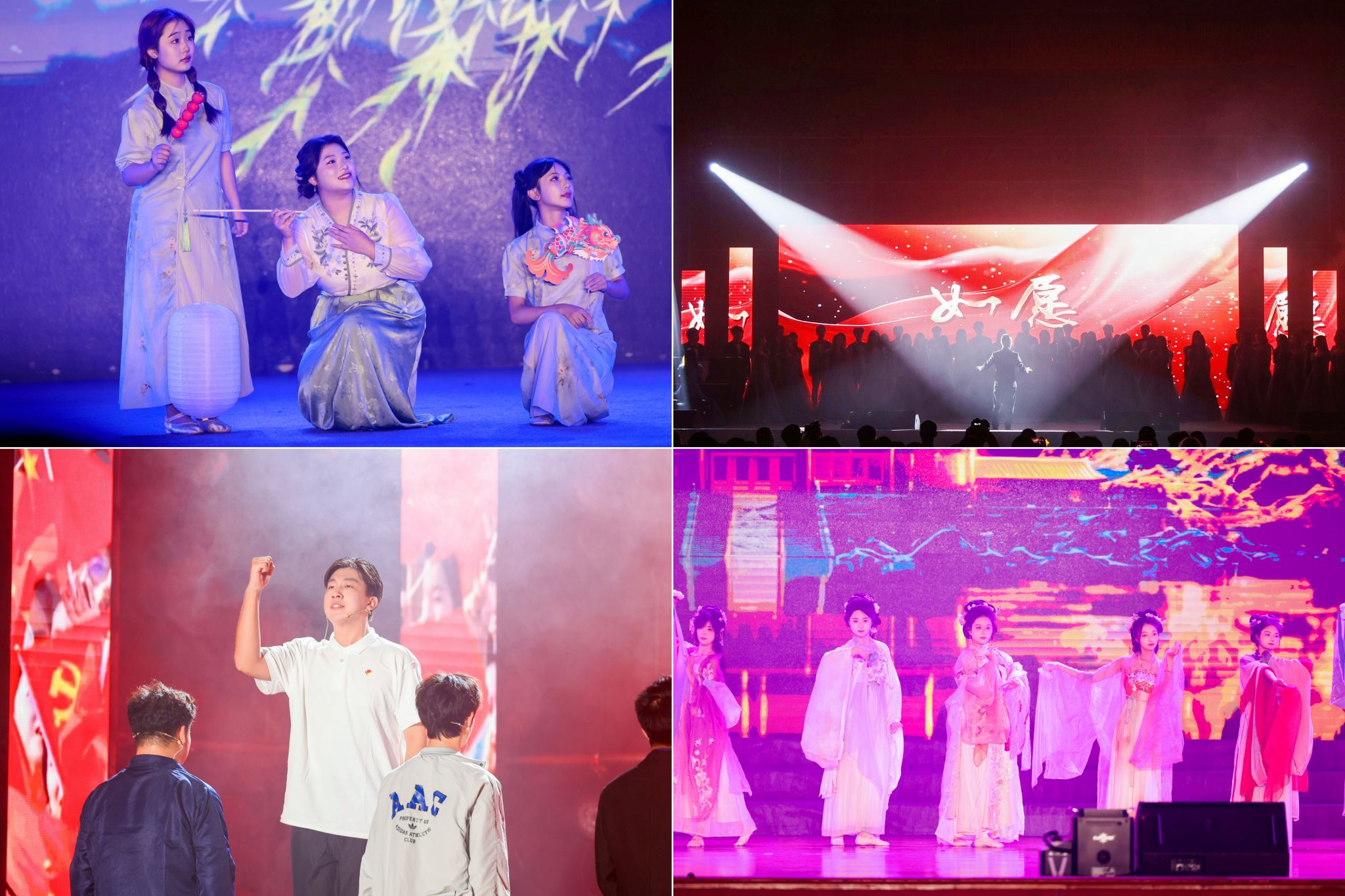 晚会以“青春飞扬” 作序,共设三个篇章。在气势磅礴的《秦王破阵乐》中,晚会进入第一篇章——“家国锦绣”。情景朗诵《红船》生动展现了中国共产党的光辉历程。中国风流行舞《中华雄狮》尽情表达着对中华大地的深沉热爱。“风信子”教师合唱团带来的《这世界那么多人》,引领听众回忆起生命中每一段温暖的相遇。一曲《初光・黄金时代》,舞蹈中舞影随光动,仿佛那璀璨的黄金时代就在眼前。藏族舞蹈《甘孜踢踏》中,藏族人民以热情的舞蹈表达着对生活的热爱以及对大自然的敬畏之情。国风走秀《烟袋斜街》将中国瑰宝青花瓷以走秀形式精彩演绎,充分展现中华文化的深厚底蕴。这一章的表演淋漓尽致地展现了成信学子对家国的热爱、对文化的传承以及对美好生活的向往与追求。