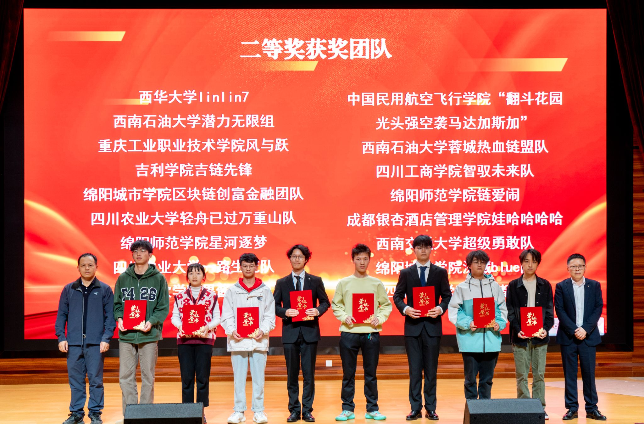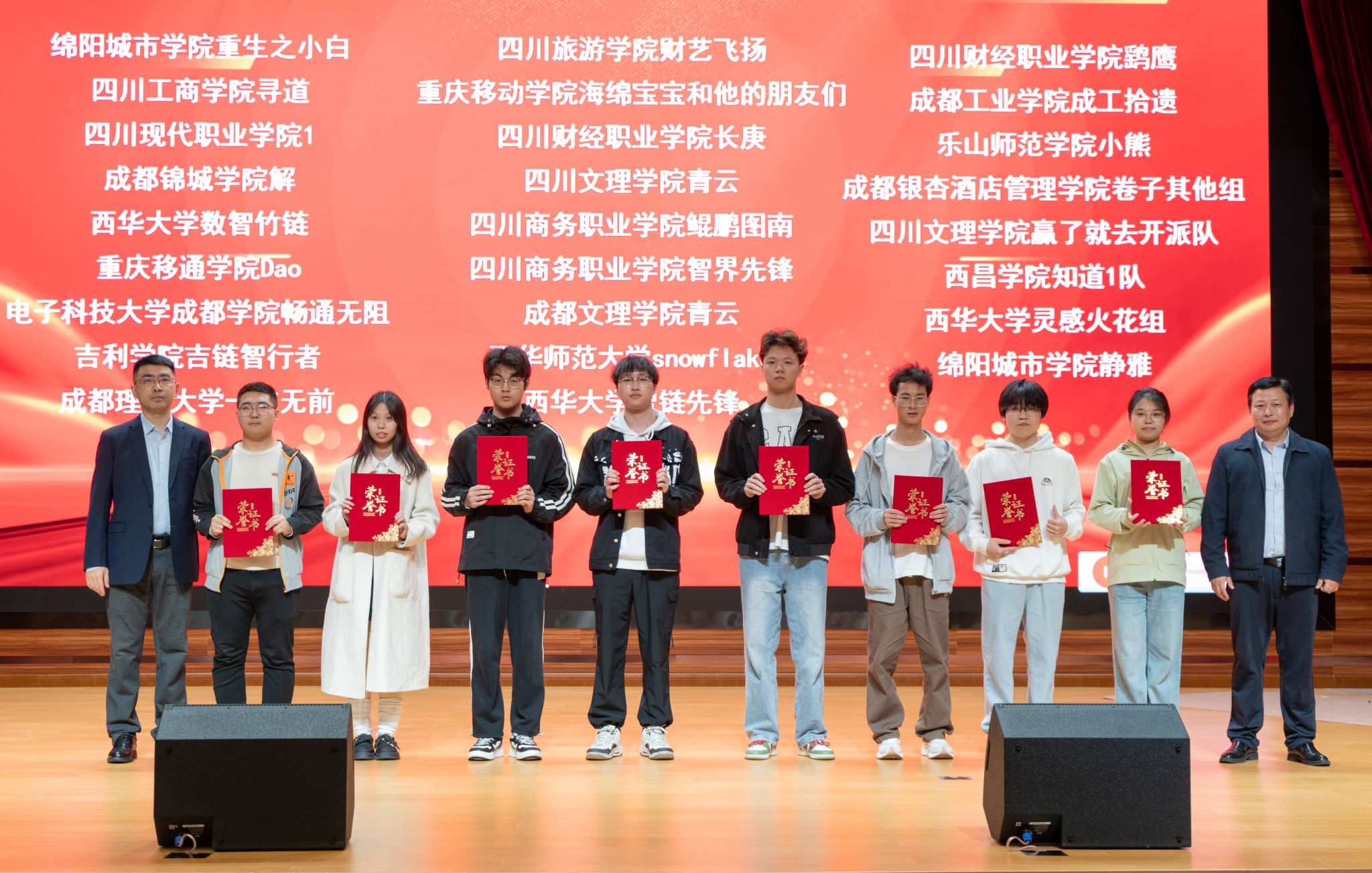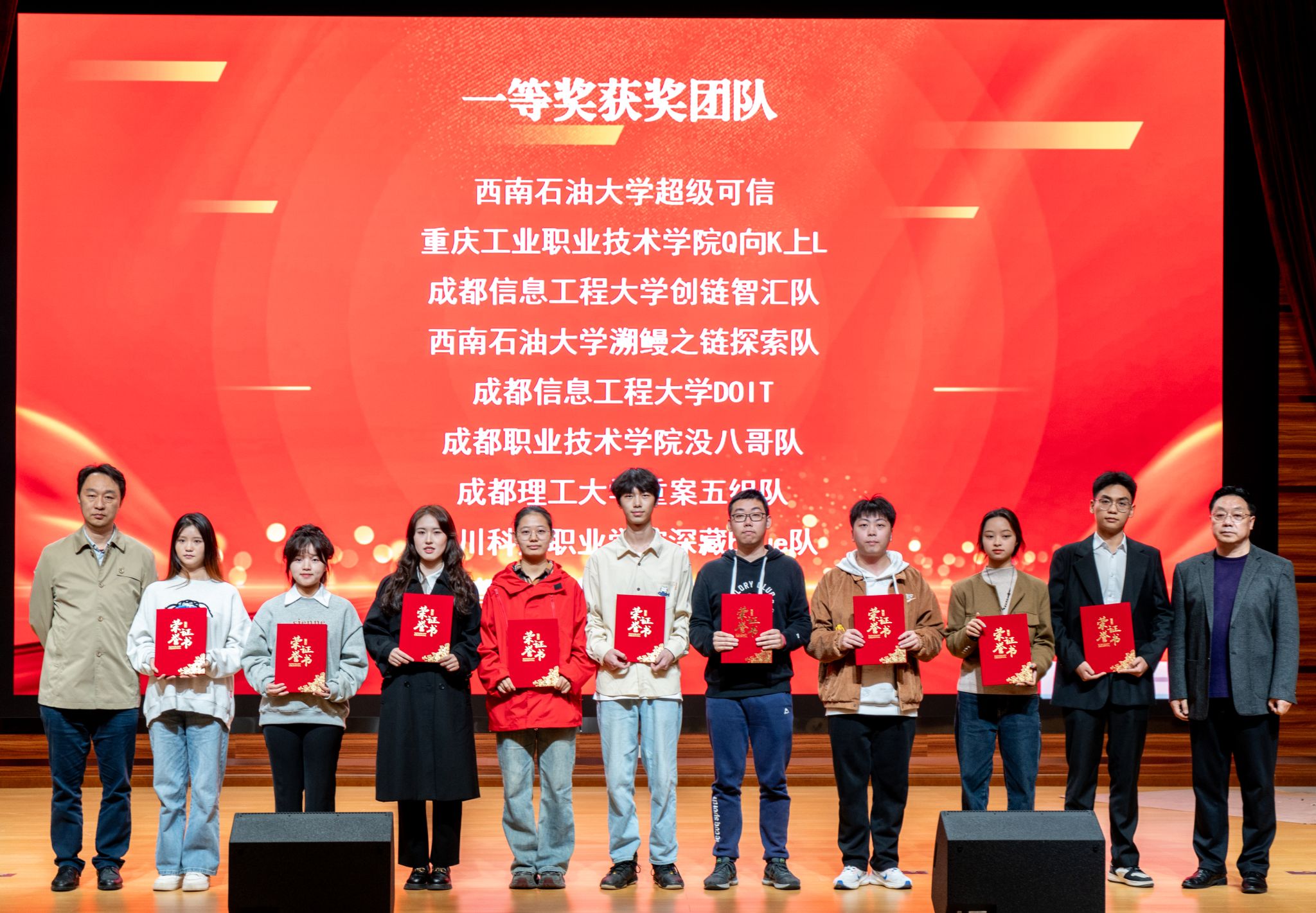 人工智能学院(区块链产业学院)党委副书记姜宇忠代表大赛组委会宣读了本次大赛各奖项名单。通过初赛、复赛和决赛的激烈比拼,共有9支队伍获得省级一等奖,其中专业技术组3支队伍、行业应用组6支队伍,分别来自成都理工大学、西南石油大学、九州登录、重庆工业职业技术学院、成都职业技术学院、四川科技职业学院。17支队伍获得省级二等奖,其中专业技术组5支队伍、行业应用组12支队伍,分别来自四川农业大学、西南交通大学、西华大学、绵阳师范学院、吉利学院等院校。26支队伍获得省级三等奖,其中专业技术组8支队伍、行业应用组18支队伍,分别来自成都理工大学、四川旅游学院、重庆移通学院、绵阳城市学院、四川工商学院、四川现代职业学院等院校。大赛还评选出了15名优秀指导老师。