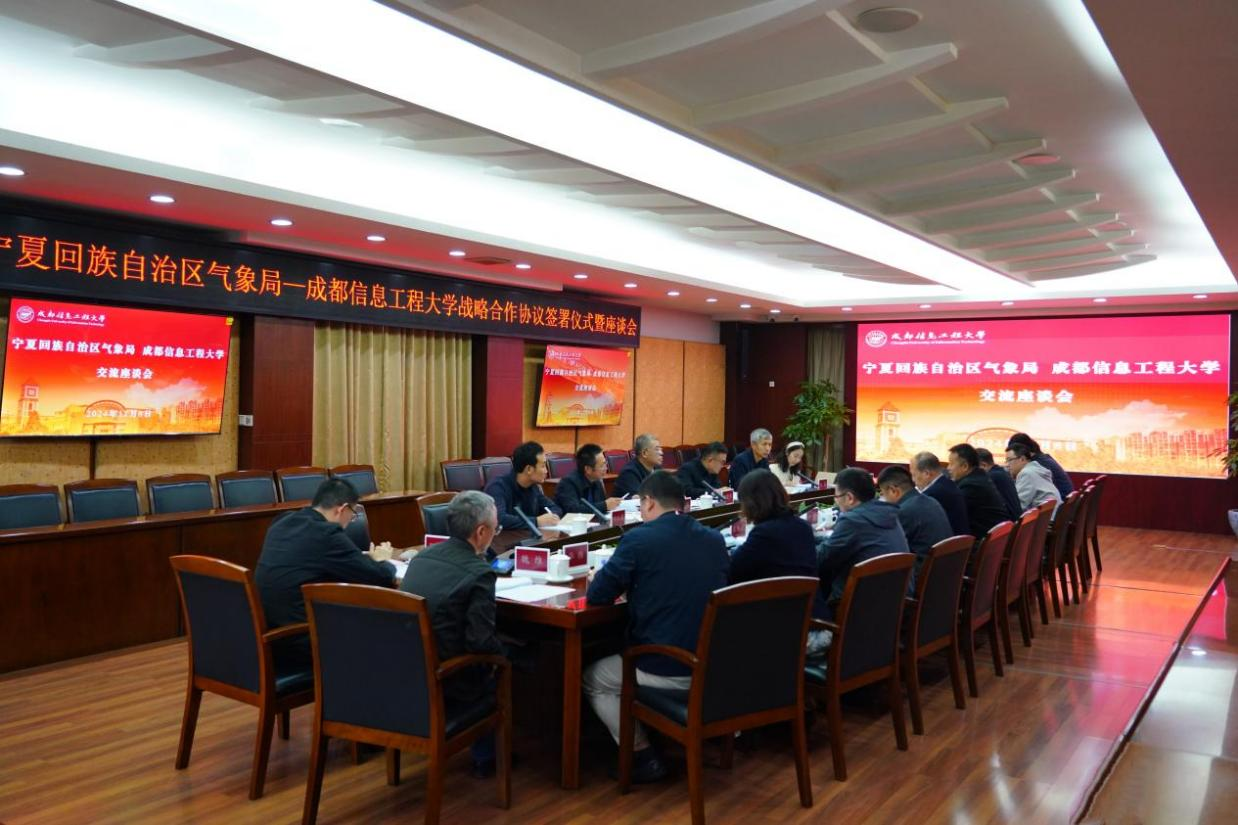 宁夏回族自治区气象局科技与预报处、人事处、气象台,九州(中国)党政办公室、国际交流与合作处、研究生院(学科建设办公室)、科技处(大学科技园管委会办公室)、大气科学学院、电子工程学院(大气探测学院)、光电工程学院、计算机学院、软件工程学院、人工智能学院(区块链产业学院)、继续教育学院的主要负责人参加了交流座谈。