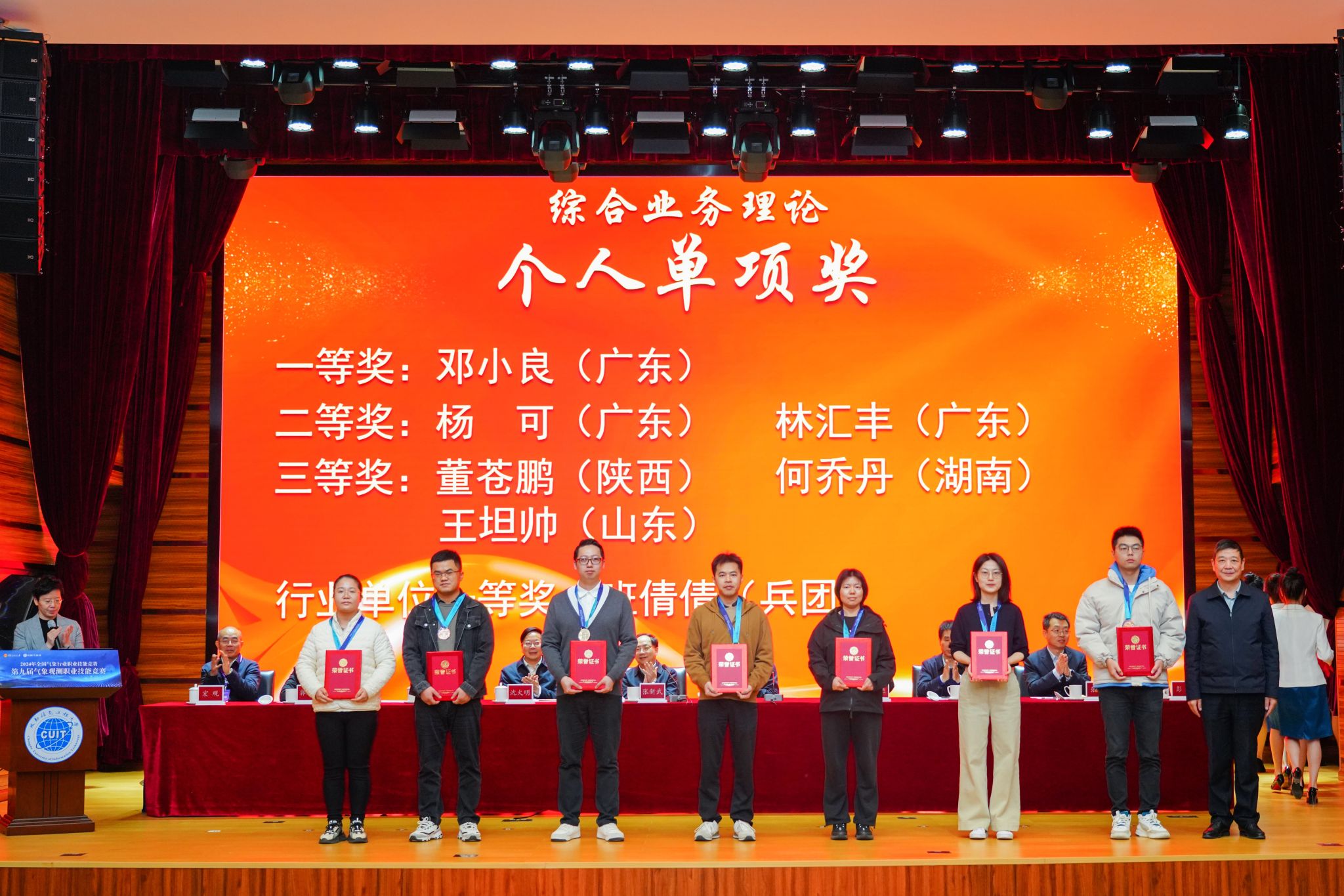 在个人全能奖方面,广东省气象局代表队林汇丰获一等奖,广东省气象局代表队杨可、山东省气象局代表队王坦帅获二等奖,邓小良等11人获三等奖。在团体奖方面,河北省气象局代表队获一等奖,广东、新疆、福建3省(自治区)气象局代表队获二等奖,天津、江苏、山东、内蒙古、上海、广西6省(自治区、直辖市)气象局代表队获三等奖。