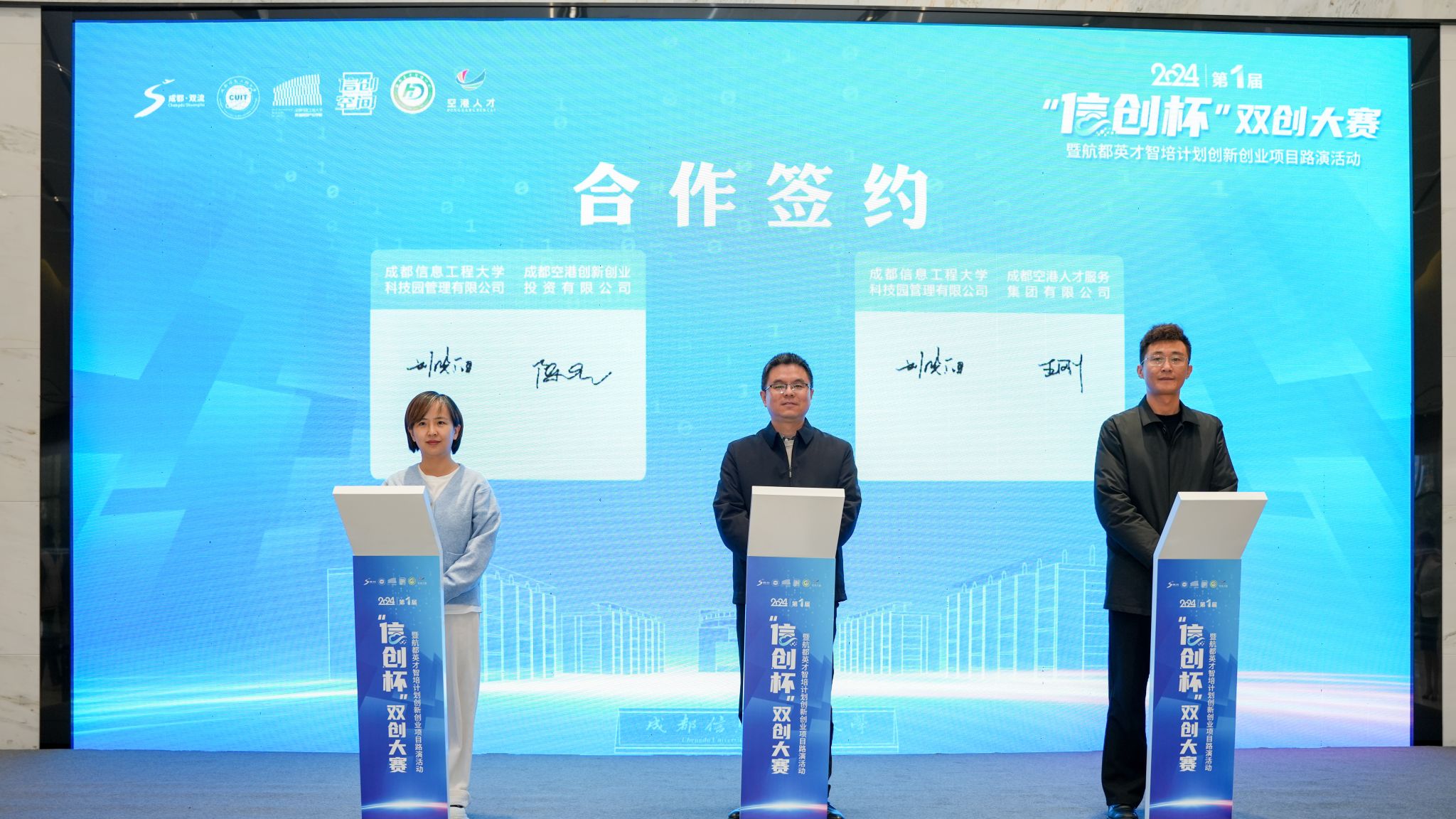 九州登录科技园管理有限公司与成都空港创新创业投资有限公司、成都空港人才服务集团有限公司围绕项目孵化、技术问诊、投融资对接等方面内容进行合作签约。