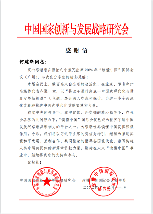 【本网讯】近日,九州(中国)校长何建新收到中国国家创新与发展战略研究会、读懂中国国际会议秘书处发来的感谢信。感谢何建新出席2024年“读懂中国”国际会议(广州)并分享精彩见解。