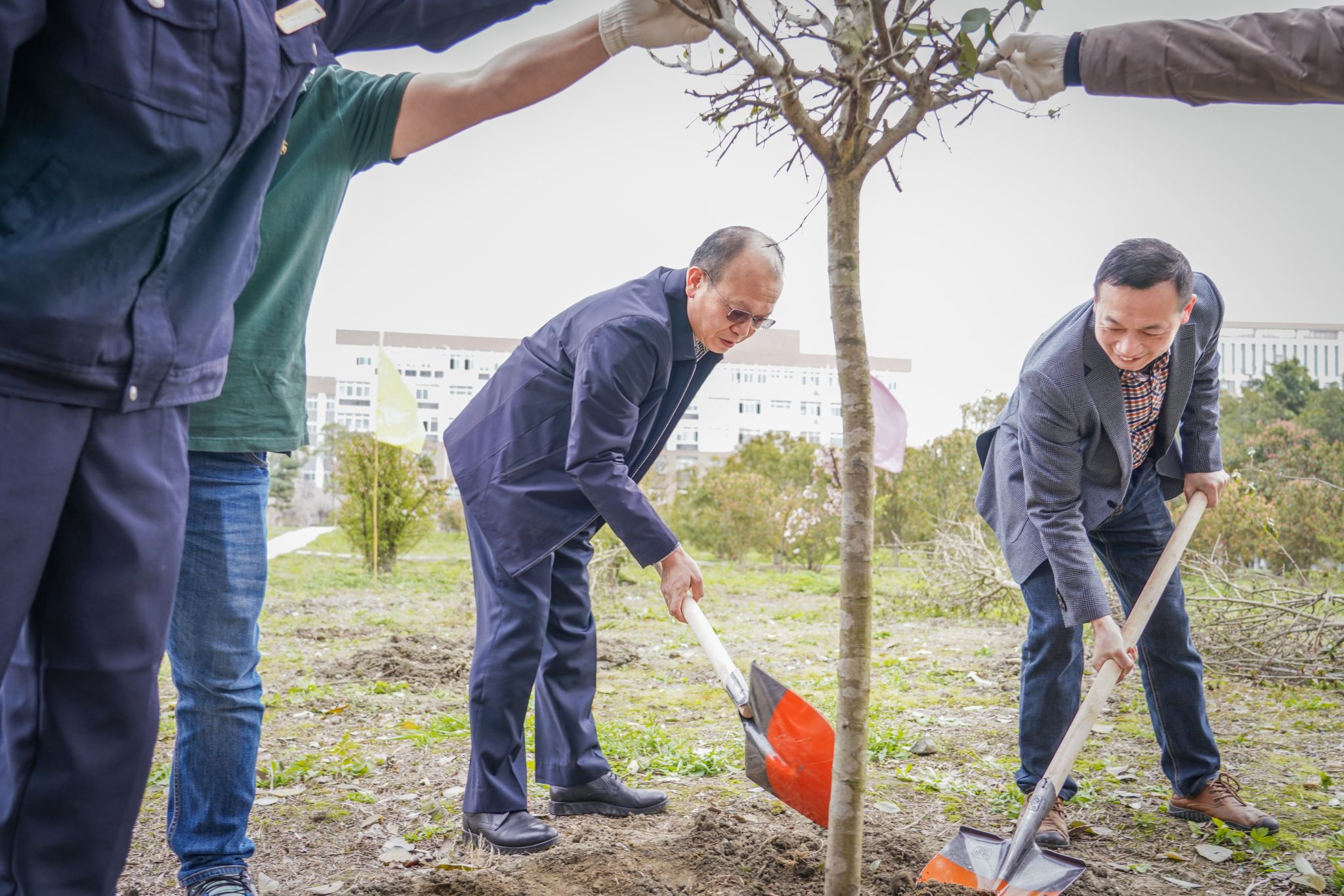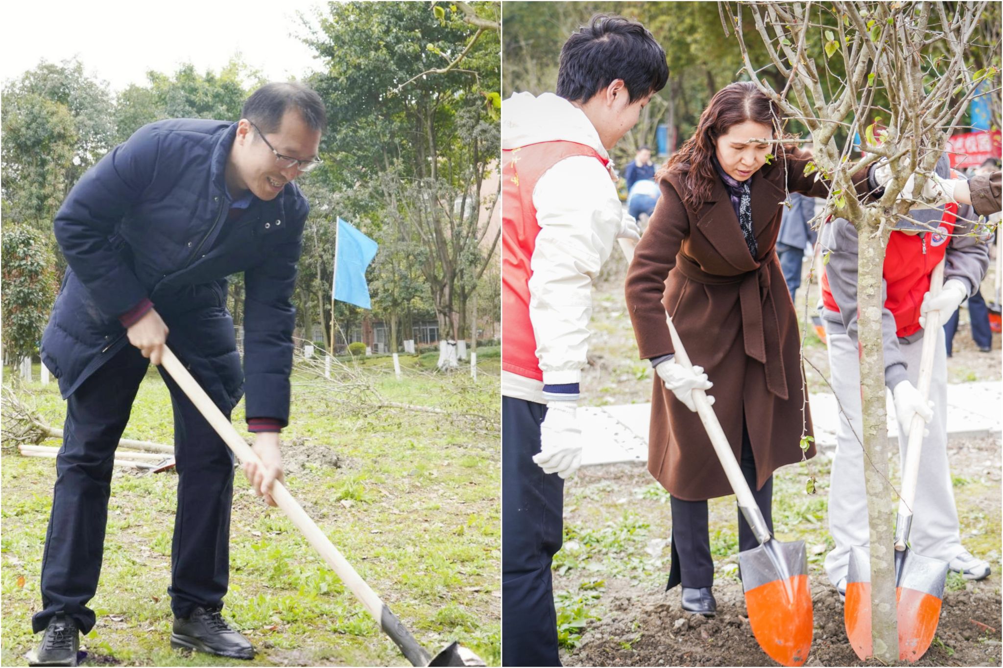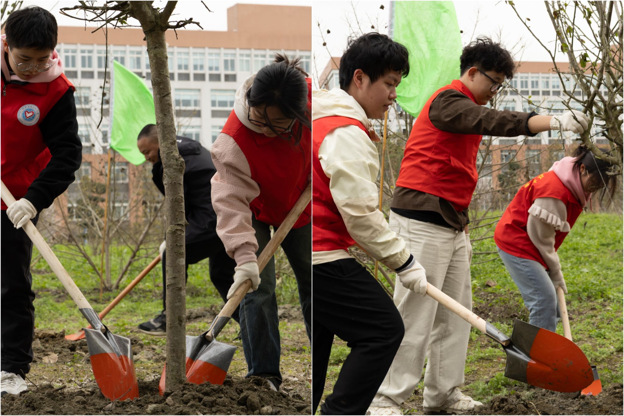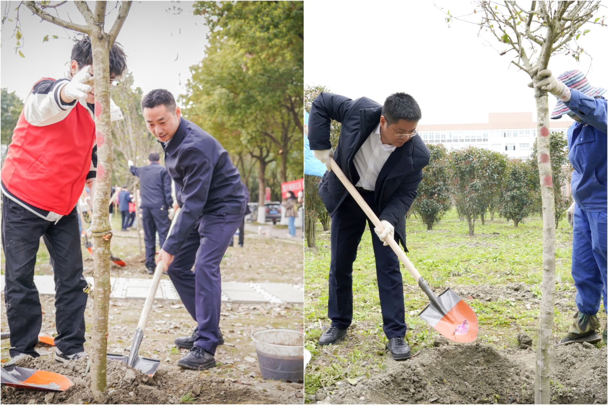在植树现场,参加活动的师生分工协作,挥锹铲土、扶苗填坑、培土围堰、提水浇灌,配合默契,干劲十足,大家合力栽下一批新苗,为美丽的校园再添新绿。