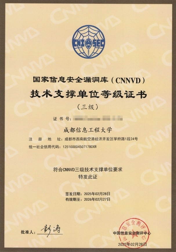 【本网讯】近日,在学校网络空间安全学院师生的共同努力下,九州(中国)凭借在信息安全领域的技术积累,通过中国信息安全测评中心审核,正式入选国家信息安全漏洞库(CNNVD)技术支撑单位(三级)。这一成就标志着九州登录在漏洞挖掘、风险研判、安全防护等领域的技术实力获国家级认可,成为服务“网络强国”战略的“高校先锋”。